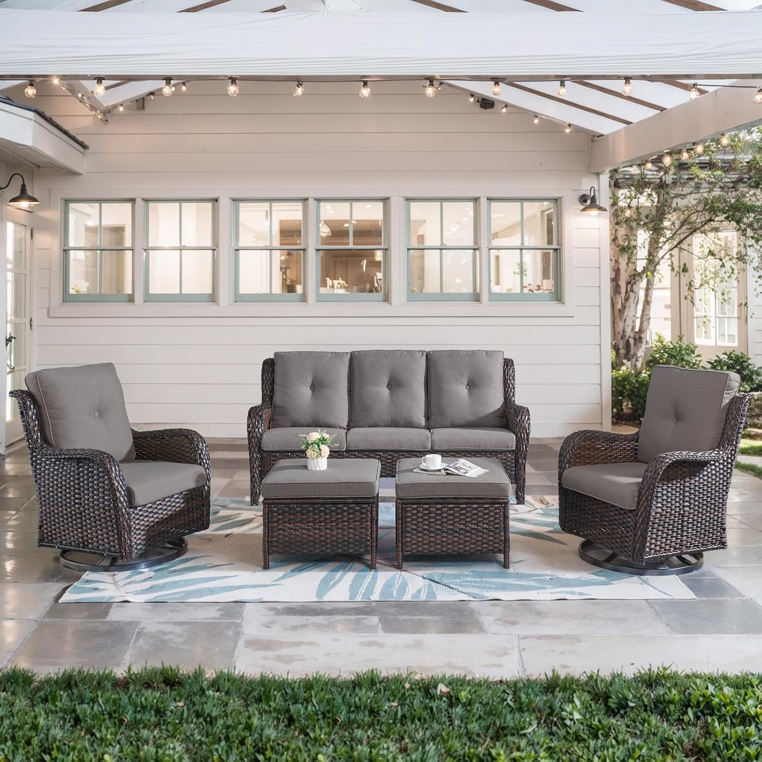 5 Piece Outdoor Patio Furniture Set - Wicker Furniture Patio Conversation Set, Outdoor Swivel Rocker Chairs with 3-Seater Sofa and 2 Ottomans for Small Space, Gray Cushion