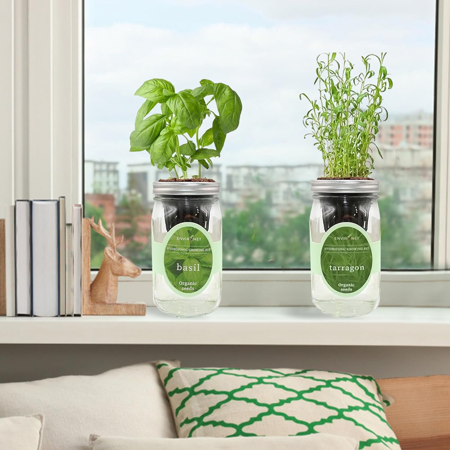 2-Pack Hydroponic Mason Jar Herb Garden Kit, Indoor Herb Garden Self-Watering Starter Kit (Basil,Tarragon)