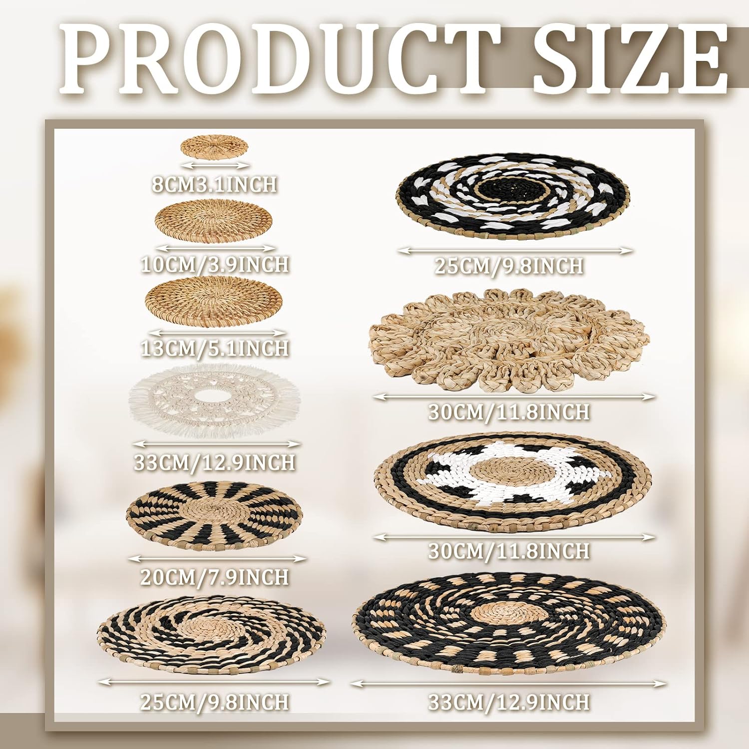 - Wide Range of Applications: boho basket wall decor set as placemats, or as decorative baskets to store toys and accessories, the rustic basket wall art is suitable for many occasions, such as hotels, restaurants, living rooms, bedrooms, schools, stores, offices, dorms, shops, spring, summer and more, bringing you an elegant and classic feeling
