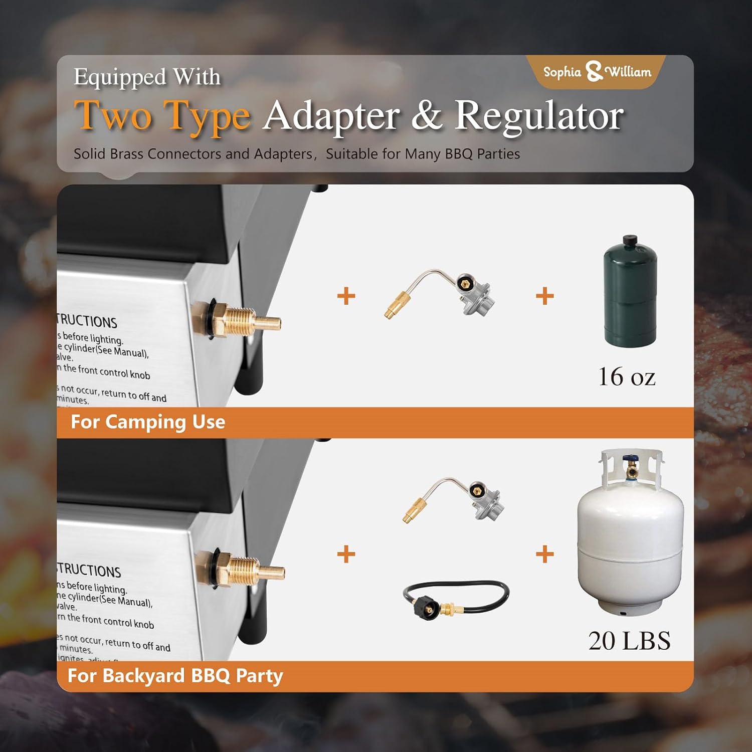 - 【Portable Gas Griddle】Regulator & adapter hose included, propane adapter hose with regulator allows you to switch from a 1 pound propane bottle to a 20 pounds propane tank. Whether you are cooking in your backyard or out in nature, you can carry it for barbecue get-together, camping, tailgating, fishing, pool parties, and more