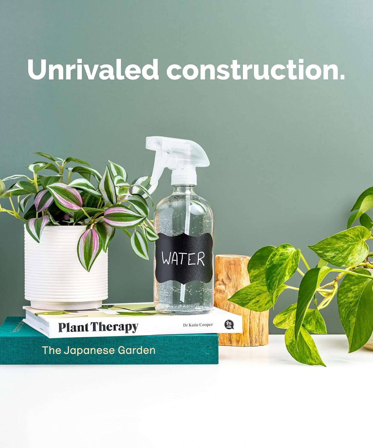 Vine Creations Glass Spray Bottles, 2 Pack Refillable Spray Bottles for Cleaning Solutions, Clear Spray Bottle for plants, Water Spray Bottle Sprayer, Glass Spray bottles 16 oz with Waterproof Labels