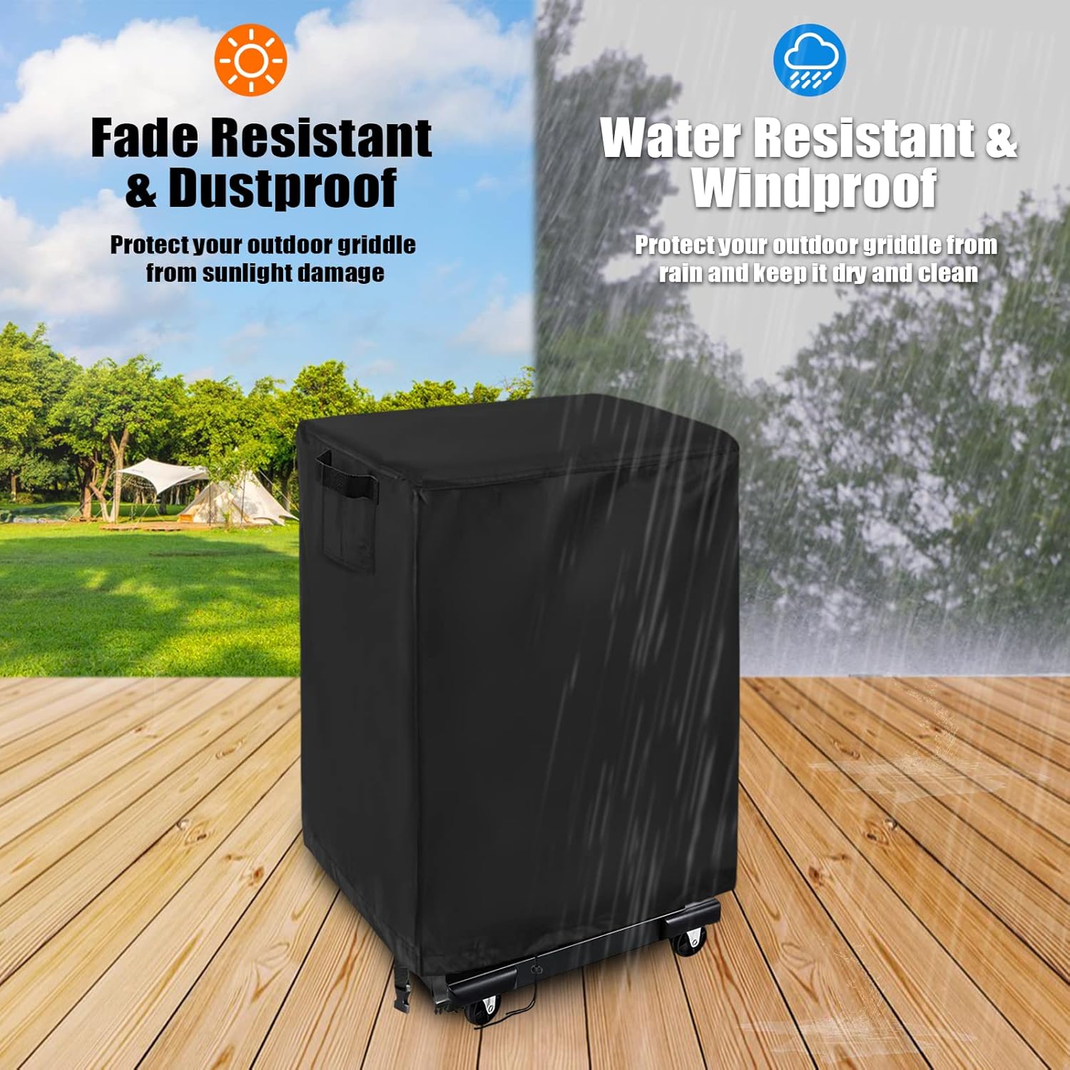 - ALL SEASON PROTECTION: Made of high-density oxford fabric, this outdoor griddle cover is waterproof, dustproof and effectively protects your 2 burner gas grill against the sunlight damage and dust, keeping it clean and dry, which is super practical for outdoor!