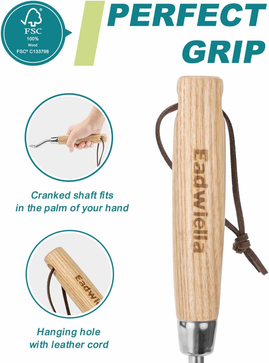 - COMFORTABLE HANDLE - The ergonomically designed hardwood handle provides a comfortable grip, reducing hand stress and tension. Hole on the handle allows hanging display and storage. The leather strap also makes this product easy to hang up in the garden shed, keeping things tidy.