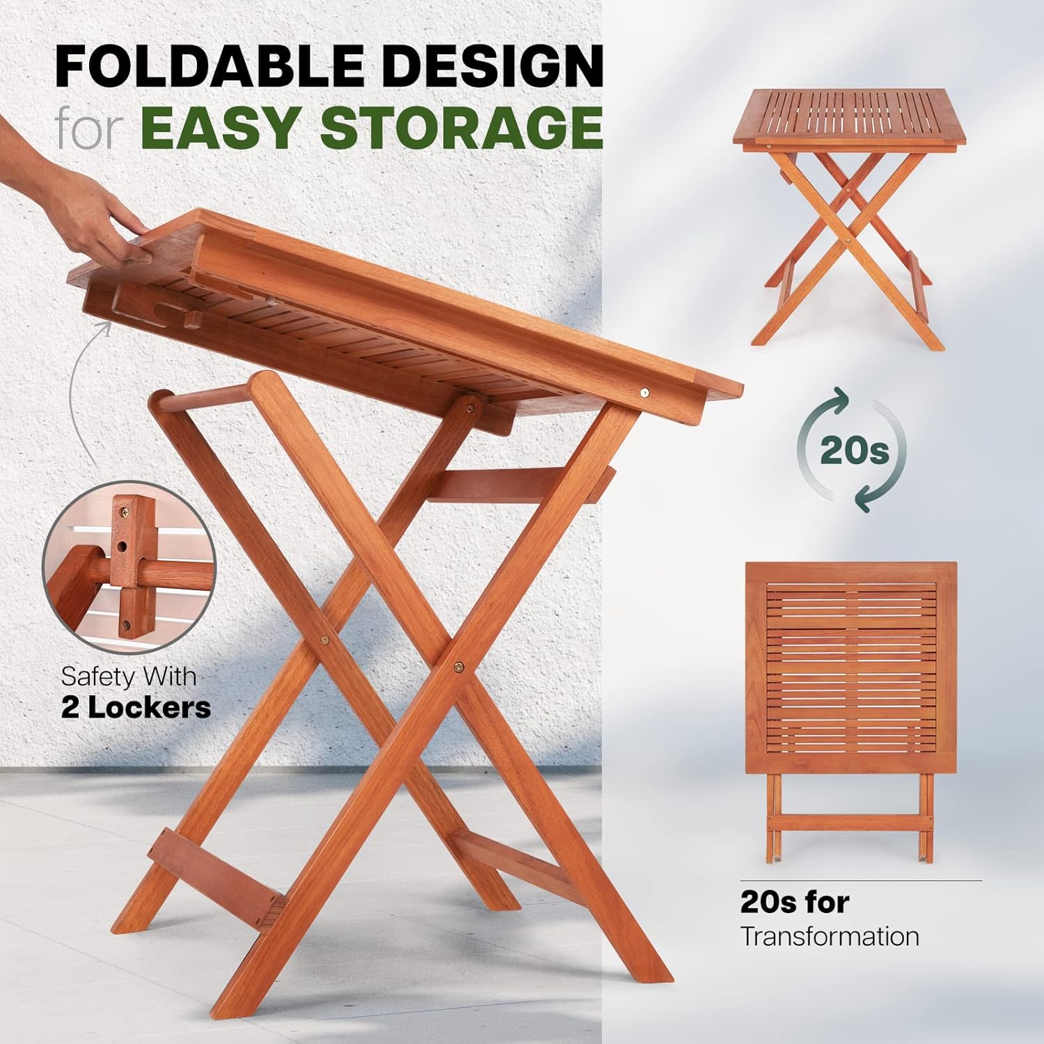 - π PREMIUM EUCALYPTUS WOOD - Our folding side table outdoor is expertly crafted from FSC-certified eucalyptus wood, coated with high-grade oil-based that protects the surface from UV rays & provides weather resistance