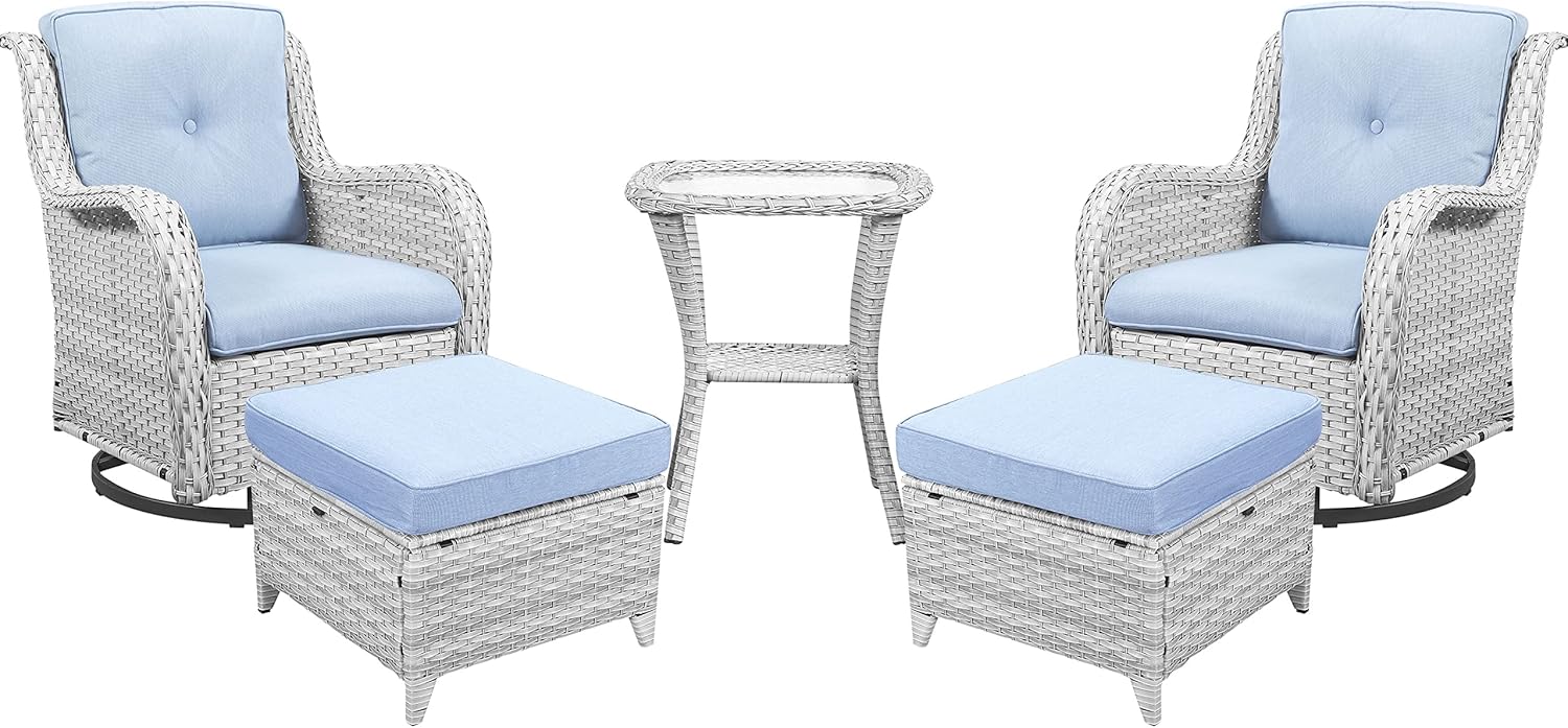 - Patio Furniture Set Introduction: The 5-piece patio furniture set includes 2 swivel glider chairs, 2 ottoman and a glass top side table, ottoman can not only be used to relax your legs, but also can be used as a small table or small stool. The swivel chairs can hold up to 350 pounds.
