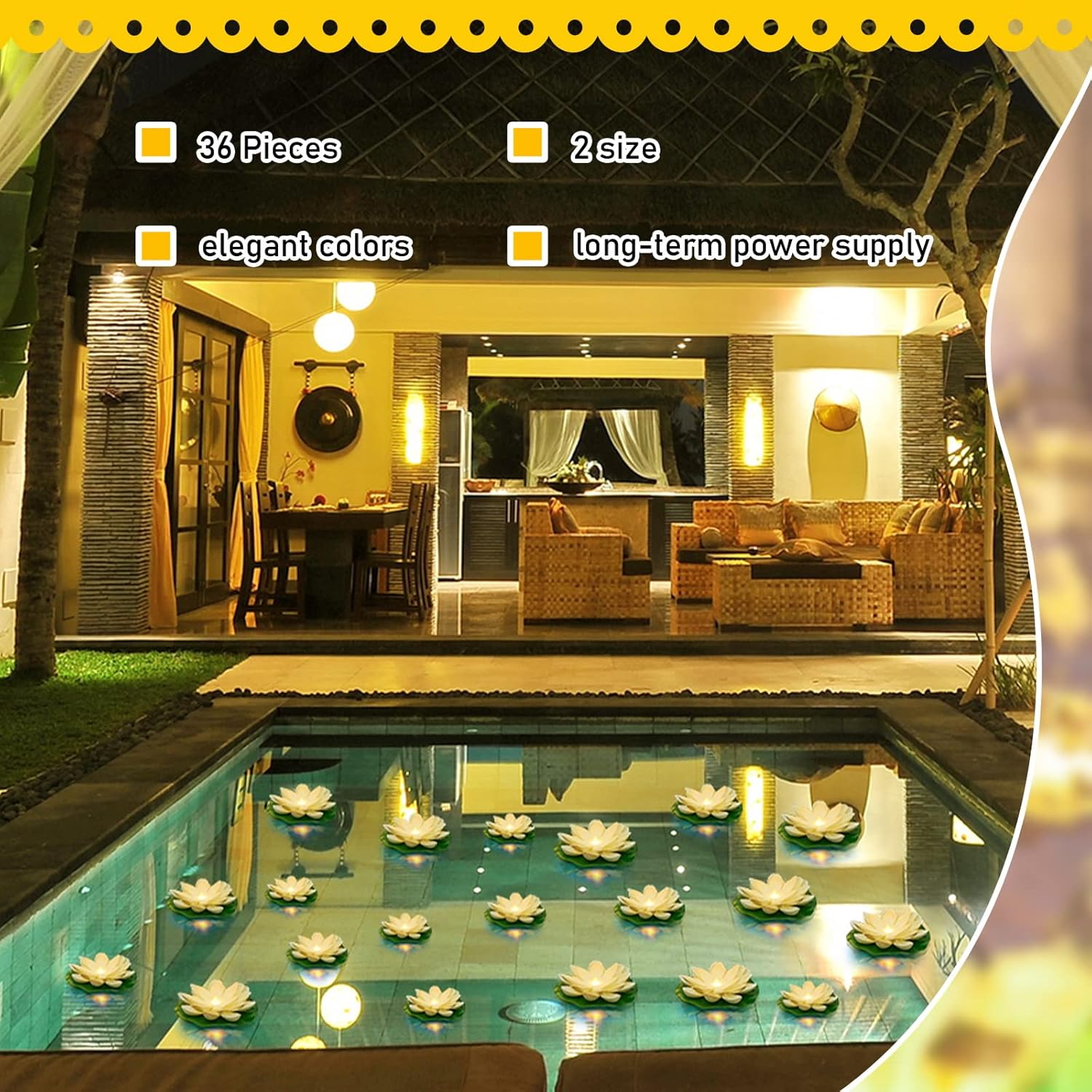 - What You Can Get: you will receive 36 pieces of lotus floating lights in elegant colors for decorating your pool, including 2 sizes, respectively 24 pieces in the small size and 12 pieces in the large size, so the quantity is sufficient for you to decorate and replace
