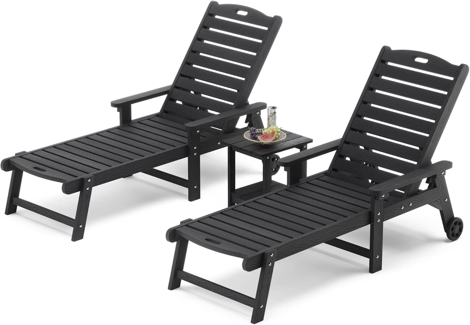LUE BONA Chaise Lounge Chairs Set with Table, 3-Piece, HDPS Chaise Lounger, 5 Positions Adjustable Lounge Chairs, Pool Lounge Chair with Wheels for Poolside, 3 Year Warranty, Black
