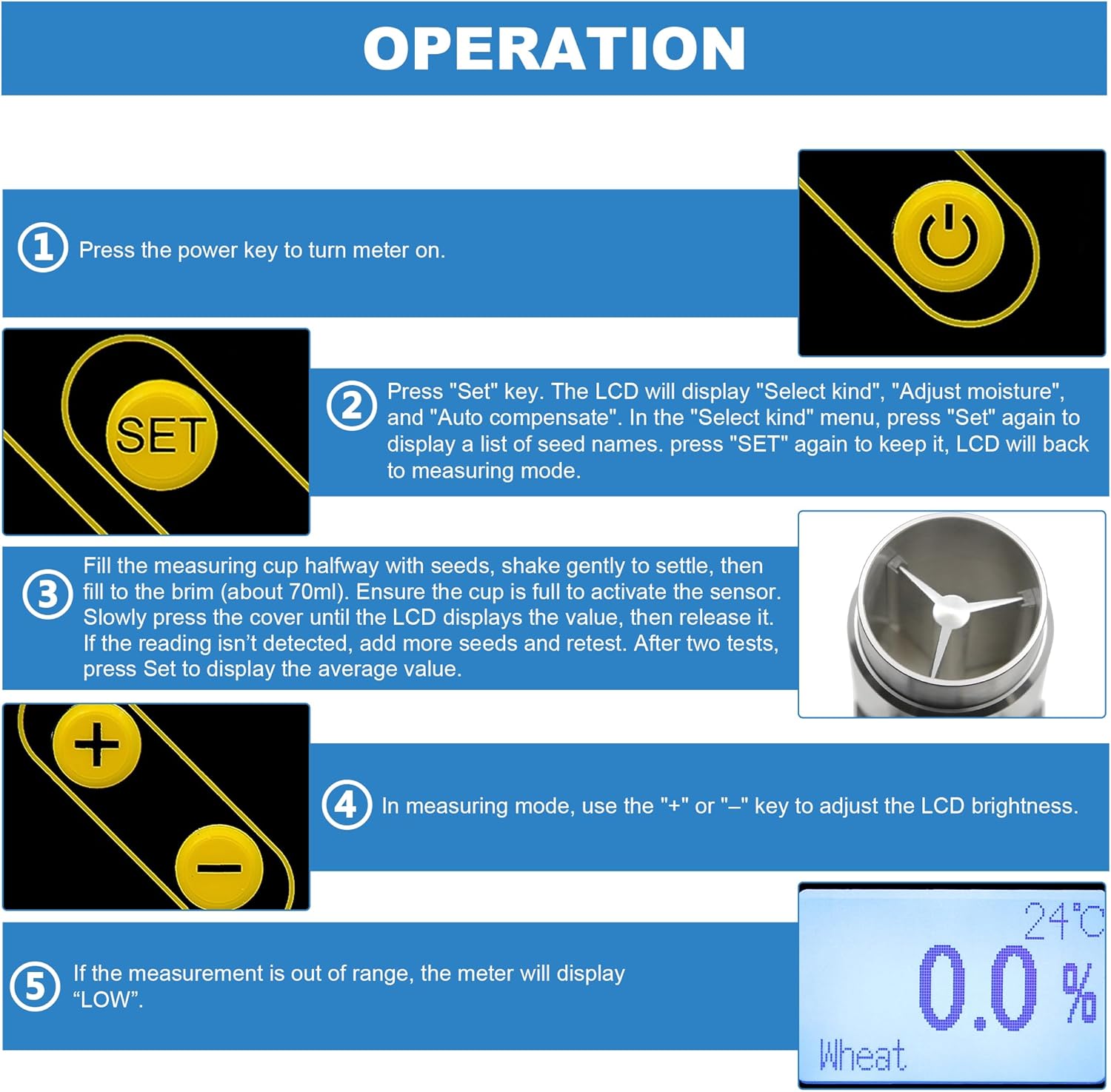 - ππππ πππππππππ - The seed moisture meter is designed for ease of use, offering both automatic and manual temperature compensation (ATC and MTC). This feature allows users to achieve consistent and accurate readings regardless of temperature fluctuations in the environment. Whether youβre conducting routine moisture checks or monitoring crop quality during harvest, the simple interface and easy-to-read results ensure minimal effort and maximum efficiency.
