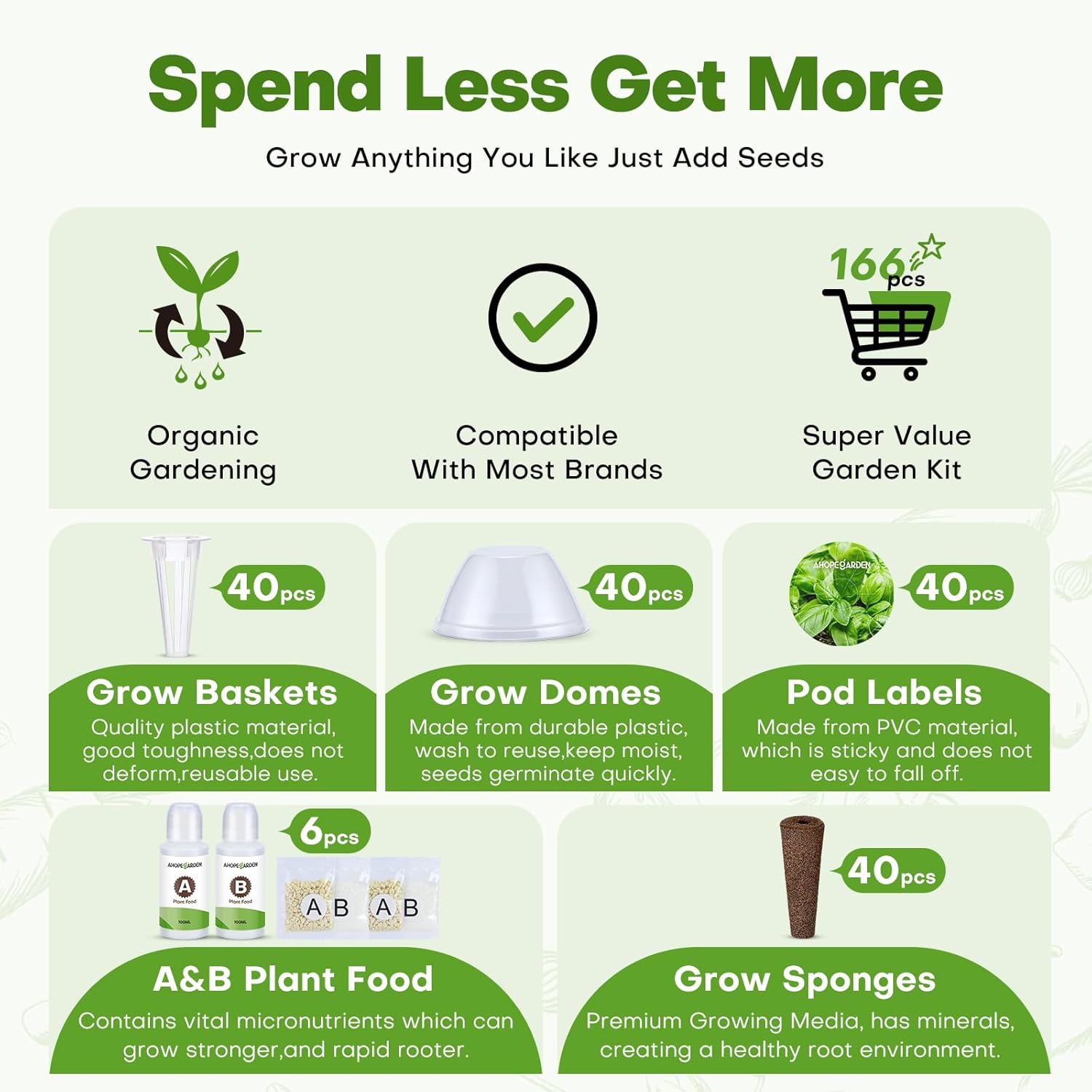 Ahopegarden 166PCS Hydroponic Pods Herb Kit: Grow Anything Kit With 600ml A&B Plant Food, 40 Grow Sponges, 40 Baskets, 40 Domes, 40 Labels, 1 Tweezer - Hydroponics Supplies for Aerogarden & Most Brand