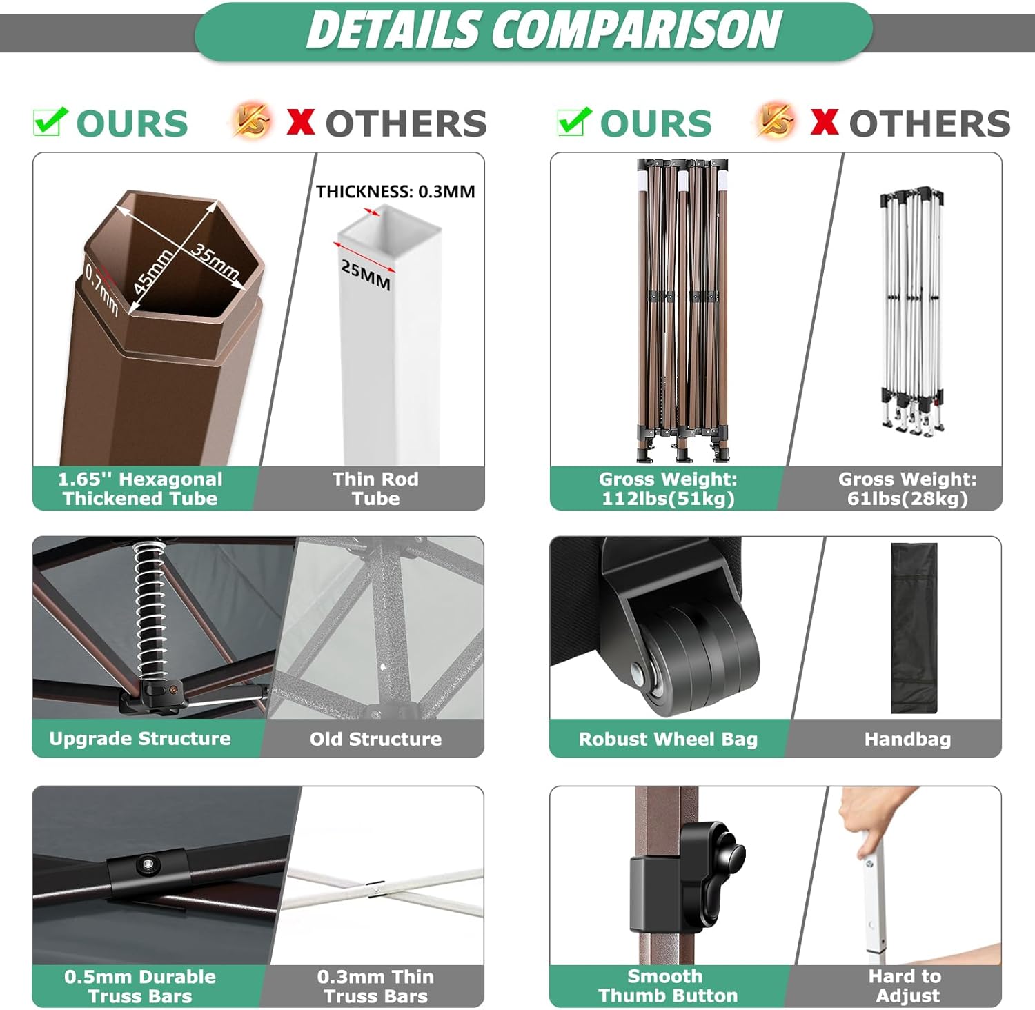 - [Upgrade Heavy Duty Canopy] The COBIZI 10x20 Heavy Duty Canopy features a commercial-grade full truss structure constructed from durable powder-coated stainless steel. The thickness of the 1.77 inch (45mm) hexagonal legs has been increased to 0.7mm/0.03 inches, providing superior stability and durability. Full truss design ensures exceptional sturdiness and rust resistance, capable of withstanding wind speeds of up to 30mph when properly secured with an number of sandbags, ropes, and stakes.