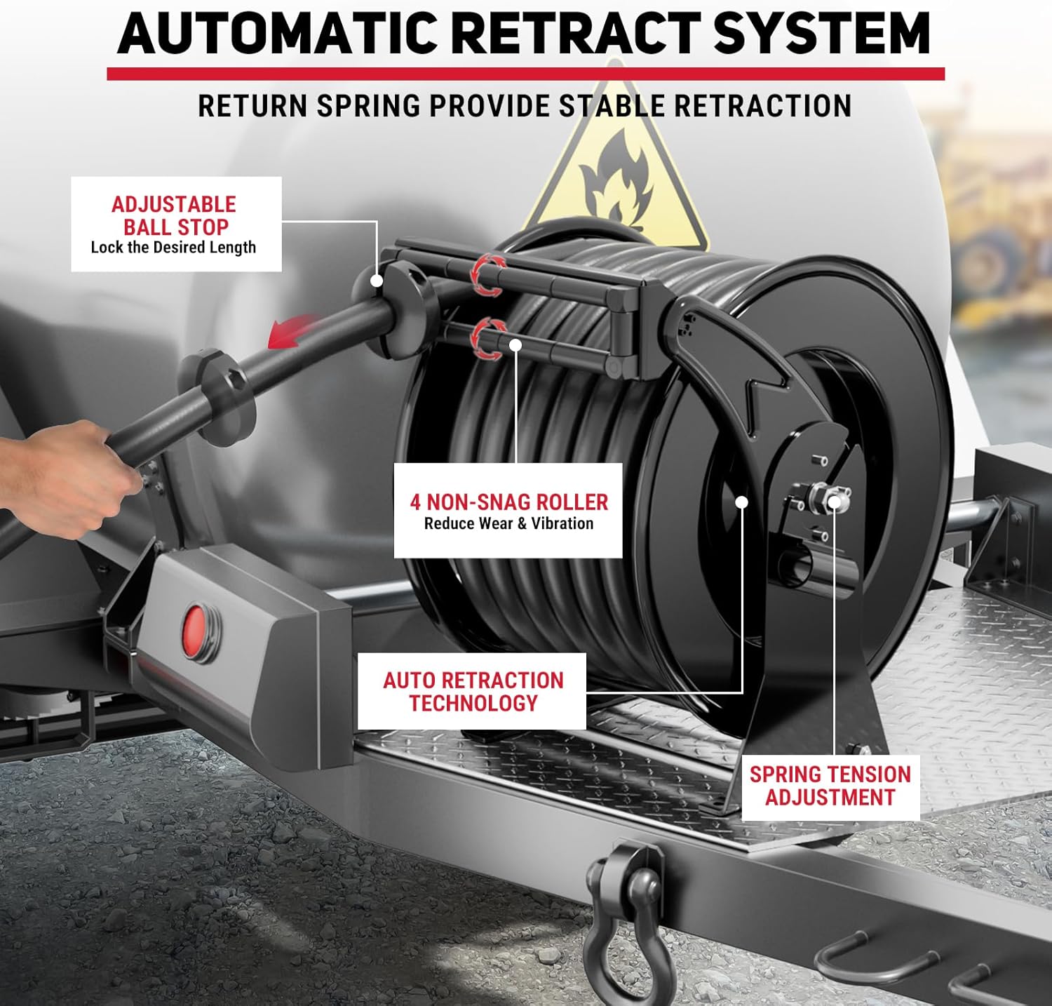 - Retractable Fuel Hose Reel: Our fuel hose reel with the retractable spring system that you don't have to spend time winding up the fuel hose after using it. Compact diesel hose reel widely used in diesel, petrol and paraffin