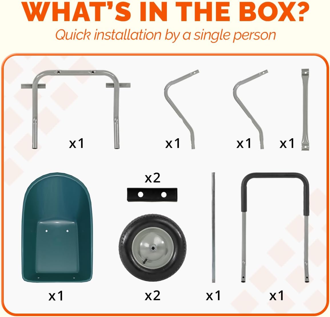 - STABLE DUAL WHEELED WHEELBARROW: The 2 wheel wheelbarrow distributes the weight evenly for a smooth and controlled ride; Two 14 in. pneumatic tires glide effortlessly across uneven and rough terrain