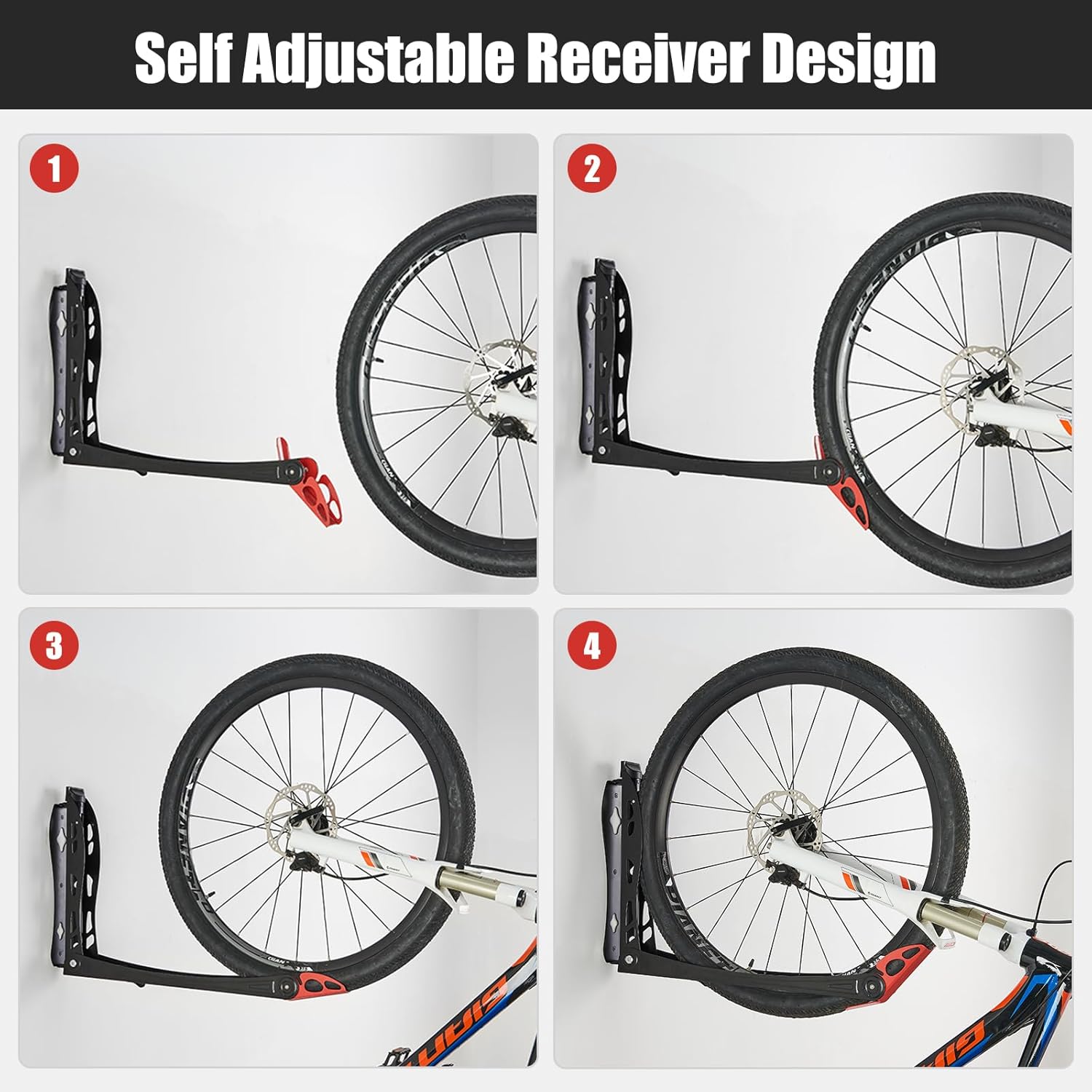 - NO LIFTING: Simply balance the bike on its rear wheel and push it into the rack, our racks have a unique self-adjusting receiver feature, no heavy lifting needed. Fits tires up to 2.1 inches wide, perfect for wheels 20-28 inches in diameter.