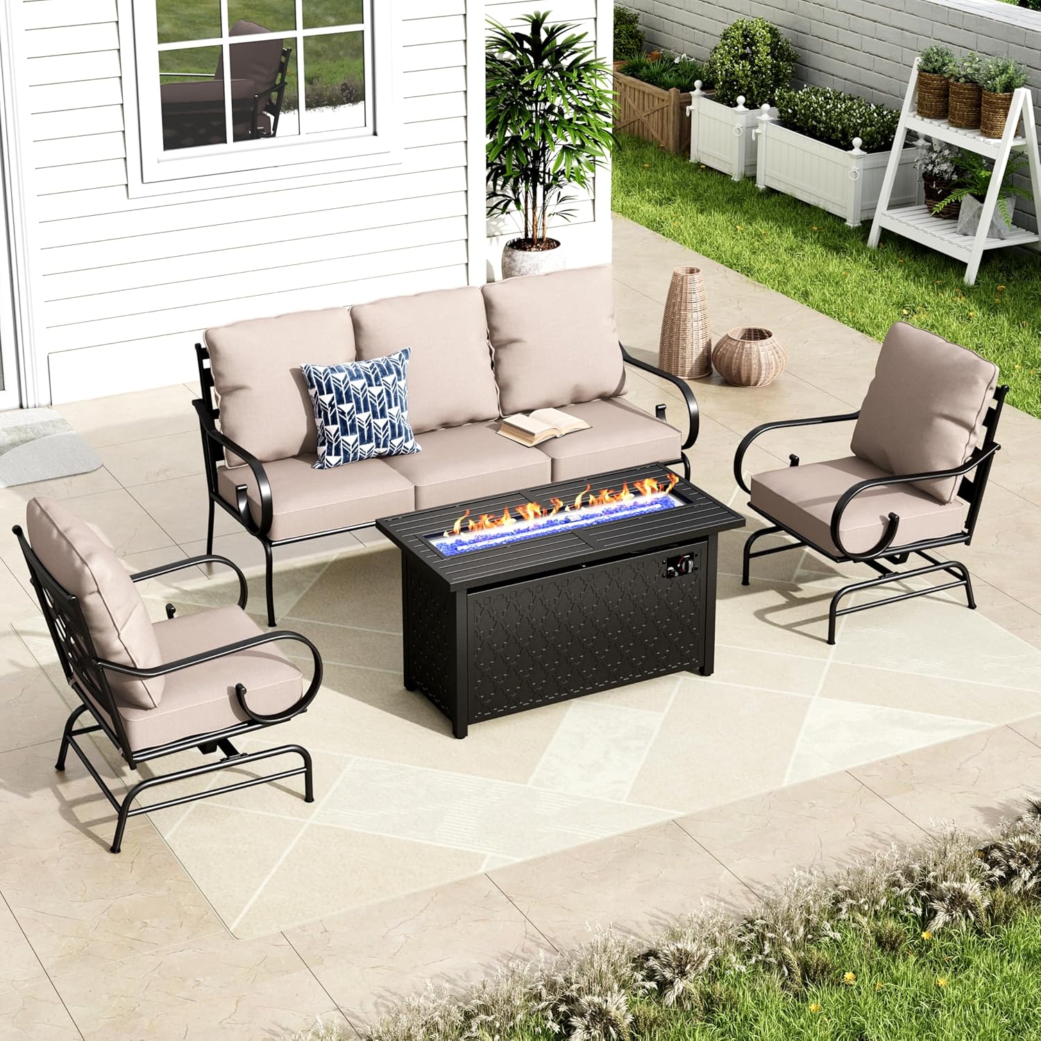 MFSTUDIO 5 Seats Large Metal Patio Conversation Sets, 4 Pieces Outdoor Sectional Furniture Sofa with 2 x Motion Chairs, 1 x 3-seat Sofa and 1 x 45 inches Rectangular Propane Fire Pit Table
