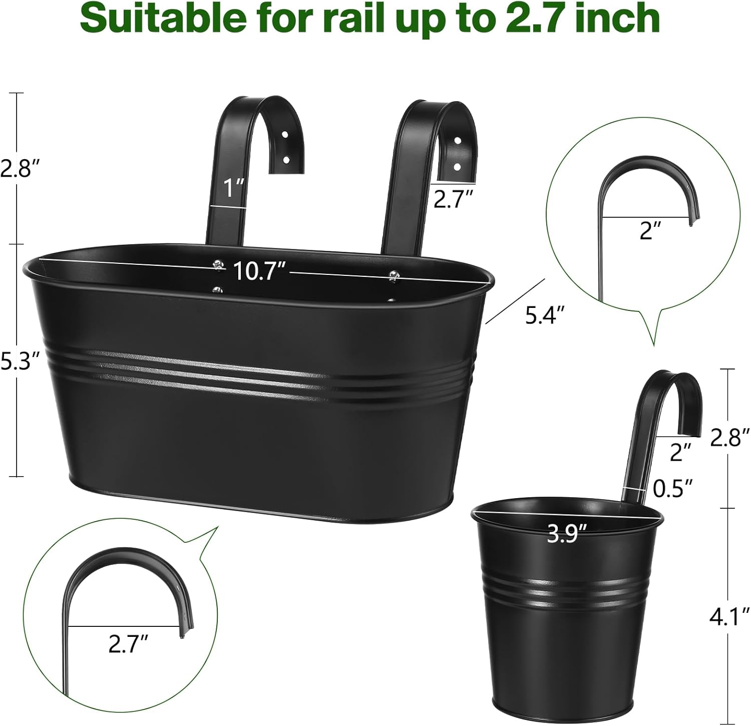 - 【Railing Planter Box】The special design with detachable hooks can be hung on the balcony, window, garden, railing, anywhere in the room, also can be used as beautiful container on desktop. Bucket planters are able to maximize inside growing space allowing dirt and roots to grow strong and deep.