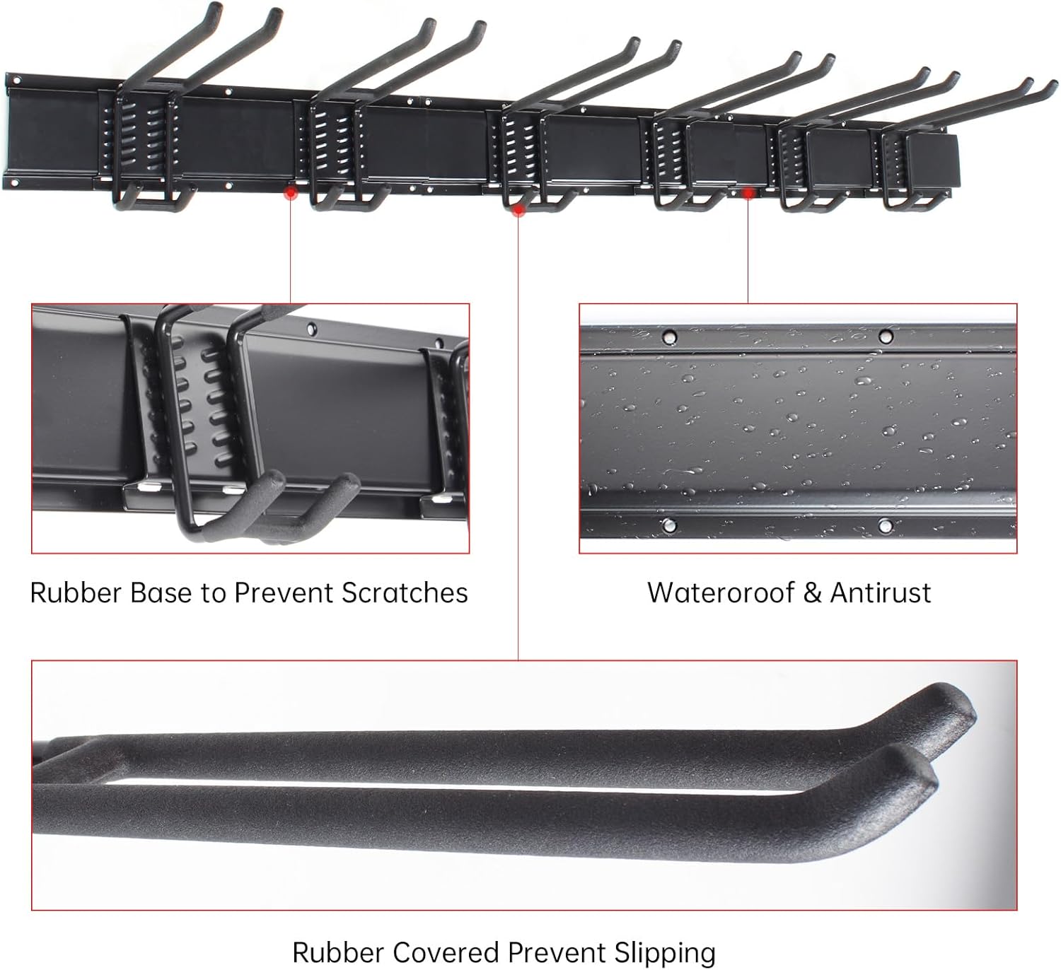 - 【Sturdy Rails & Coated Hooks】Garage storage rack hooks are made of high quality alloy steel which can load 350lbs,hooks with rubber coated that can prevent your tools from scratched or slipping.