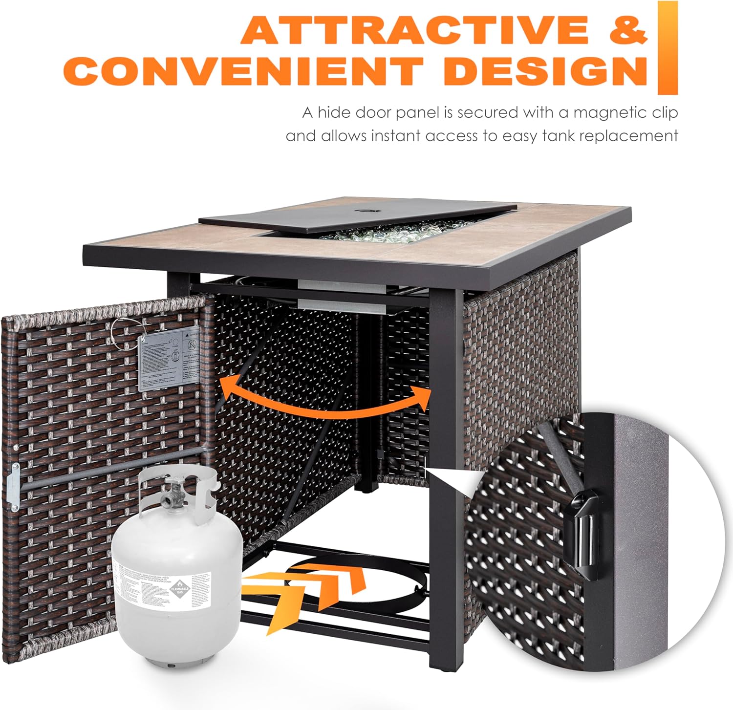 - SAFE & WARM BONFIRE: Use propane as the fuel to provide ash-free and smoke-free burning. The 50,000 BTU fire pit with a unique caliber concentrates the fire and offers sufficient warmth for your gatherings (4-8 people). Remember to keep some distance from the fire pit
