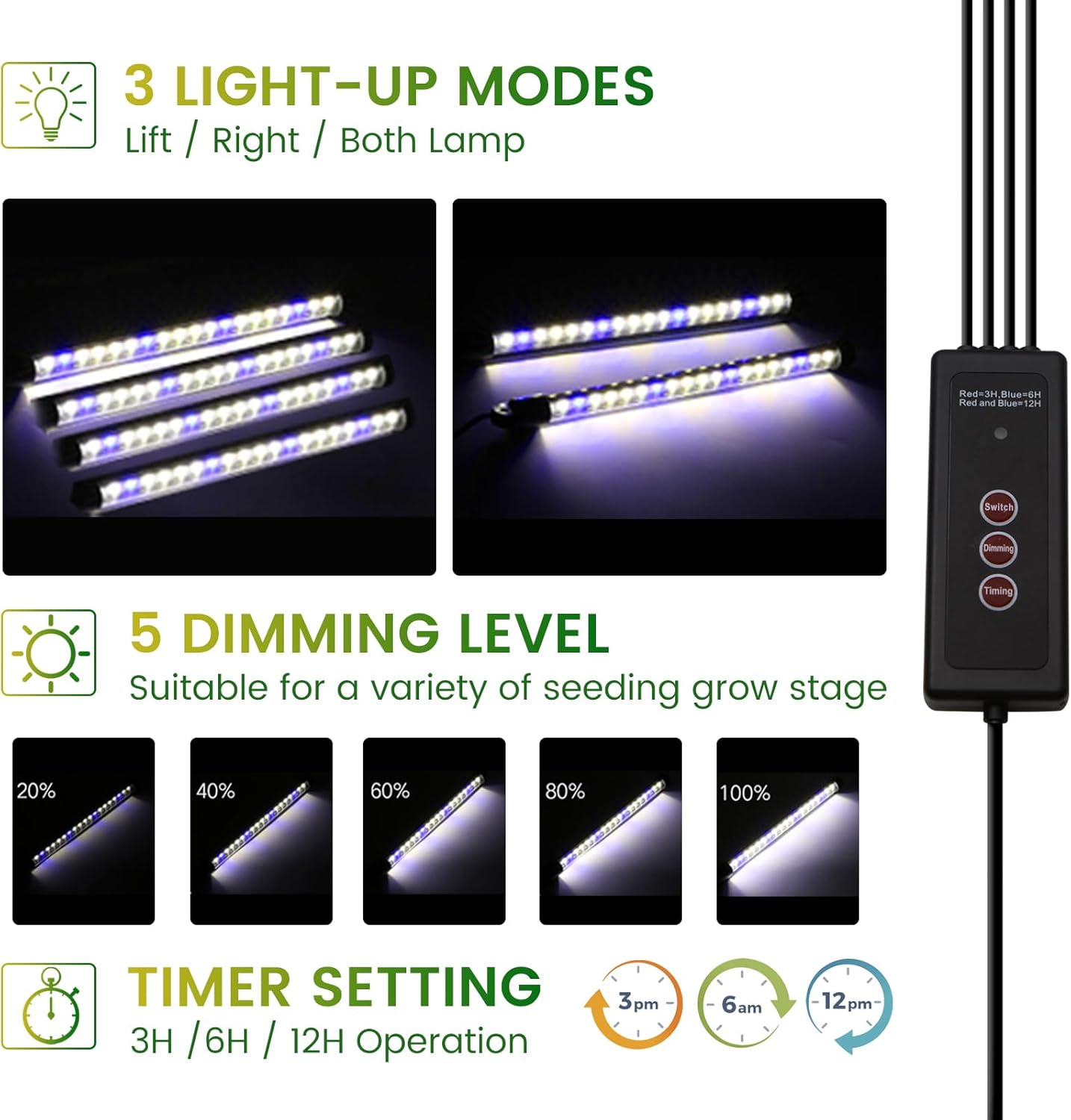 - 【5 Levels Brightness & Timer Setting】 Dimmable setting makes seedlings have the right light intensity at different periods of time;level and 3 timing functions (Red 3H/ Blue 6H/ Red+Blue 12H), and it will auto turn on/off at the same time next day