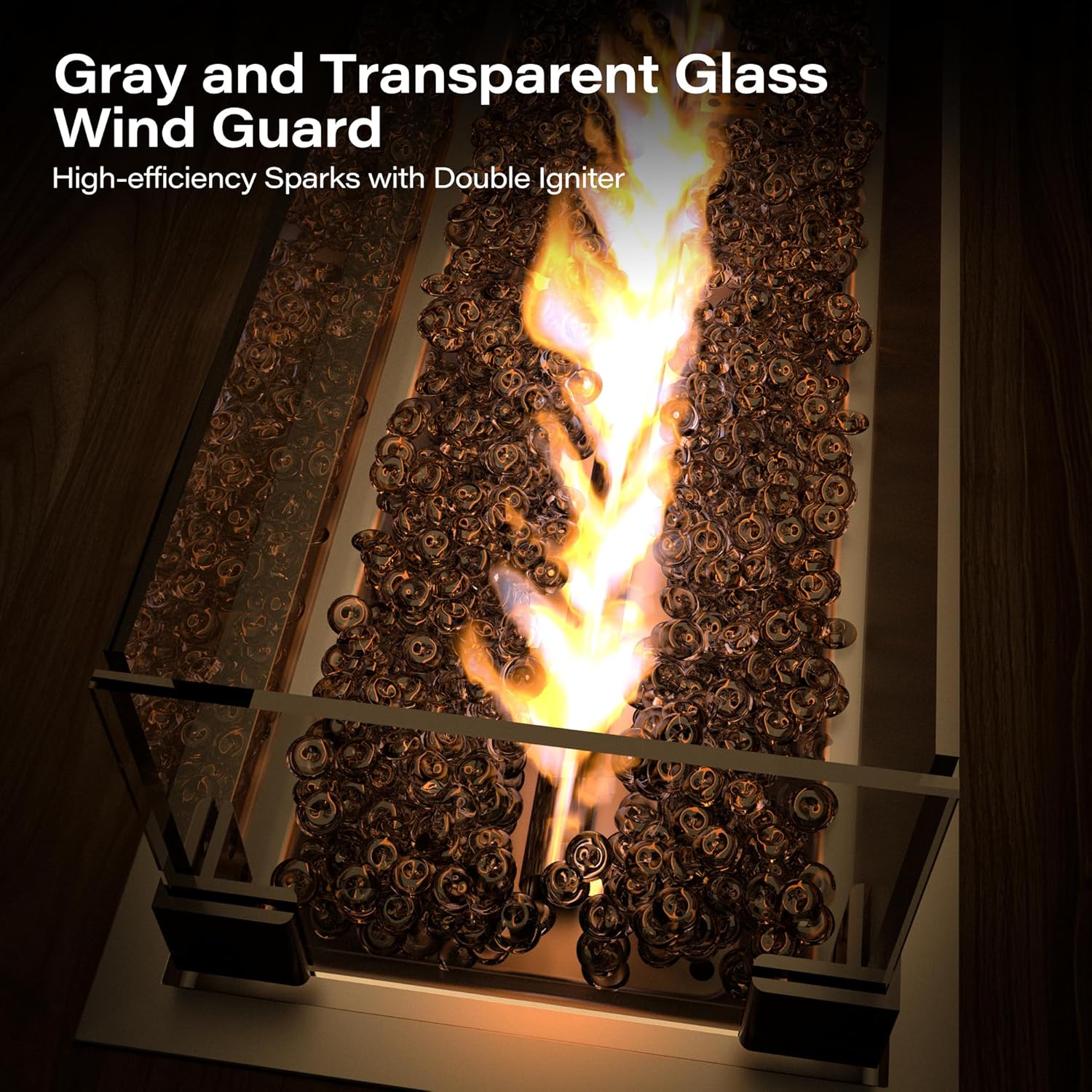 - [Unique Design] The fire pit table features a natural wood-grain tabletop and a modern gray glass wind guard, matched with any outdoor furniture. The steel frame design and 304 stainless steel burner without worrying about rust and fading issues.