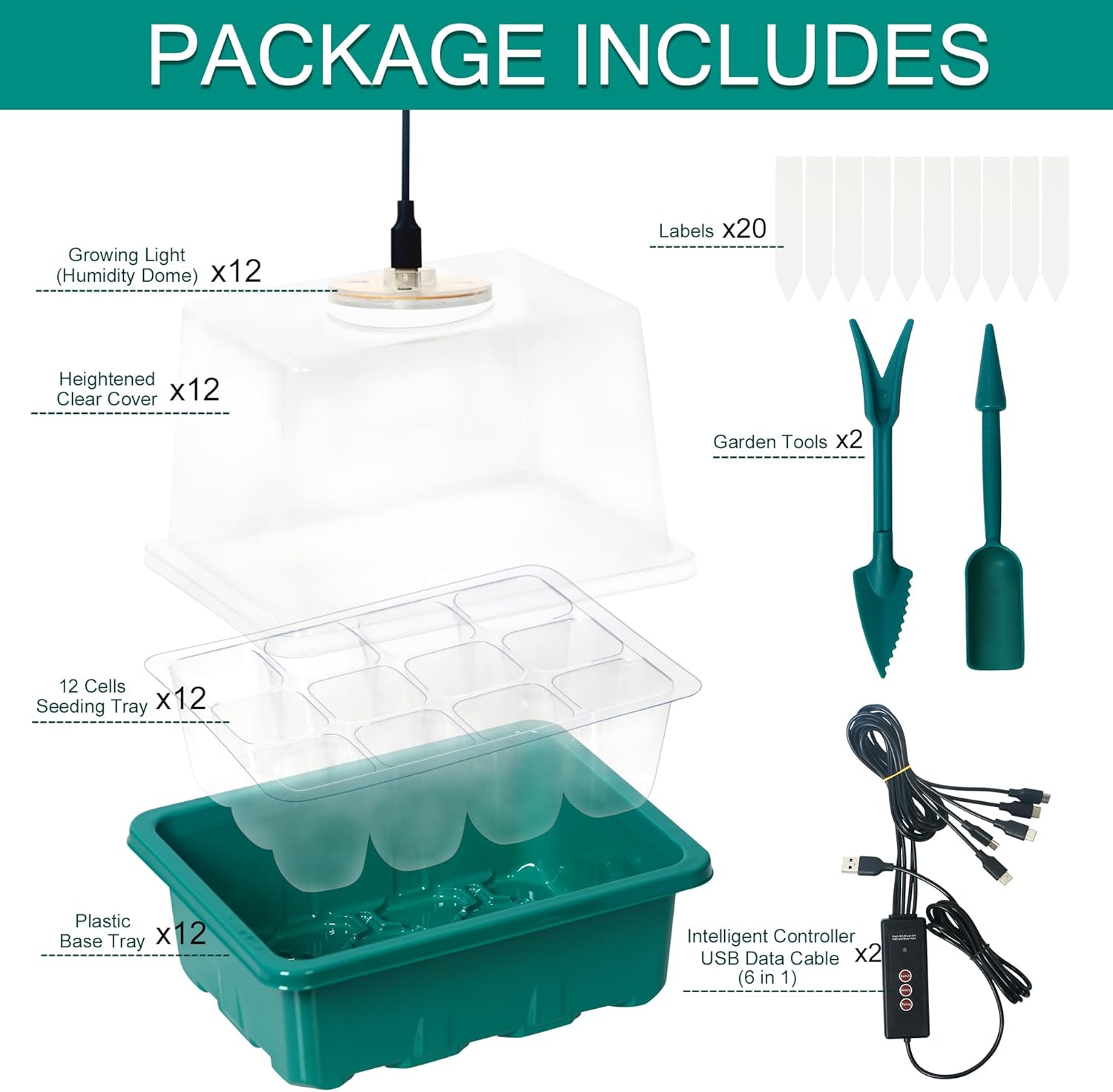 - 🌱【Wide Applications】-You will get 12 x (seed trays (12 cells per tray), humidity domes, plant grow lights, watertight base trays), 2 x smart control system, 20 x plant labels, 2 x plant tools. Perfect for indoor growing and centralized plant management, and an ideal gift for the garden starter. A great option for a large variety of plants such as flowers, vegetables, fruits and other plants.