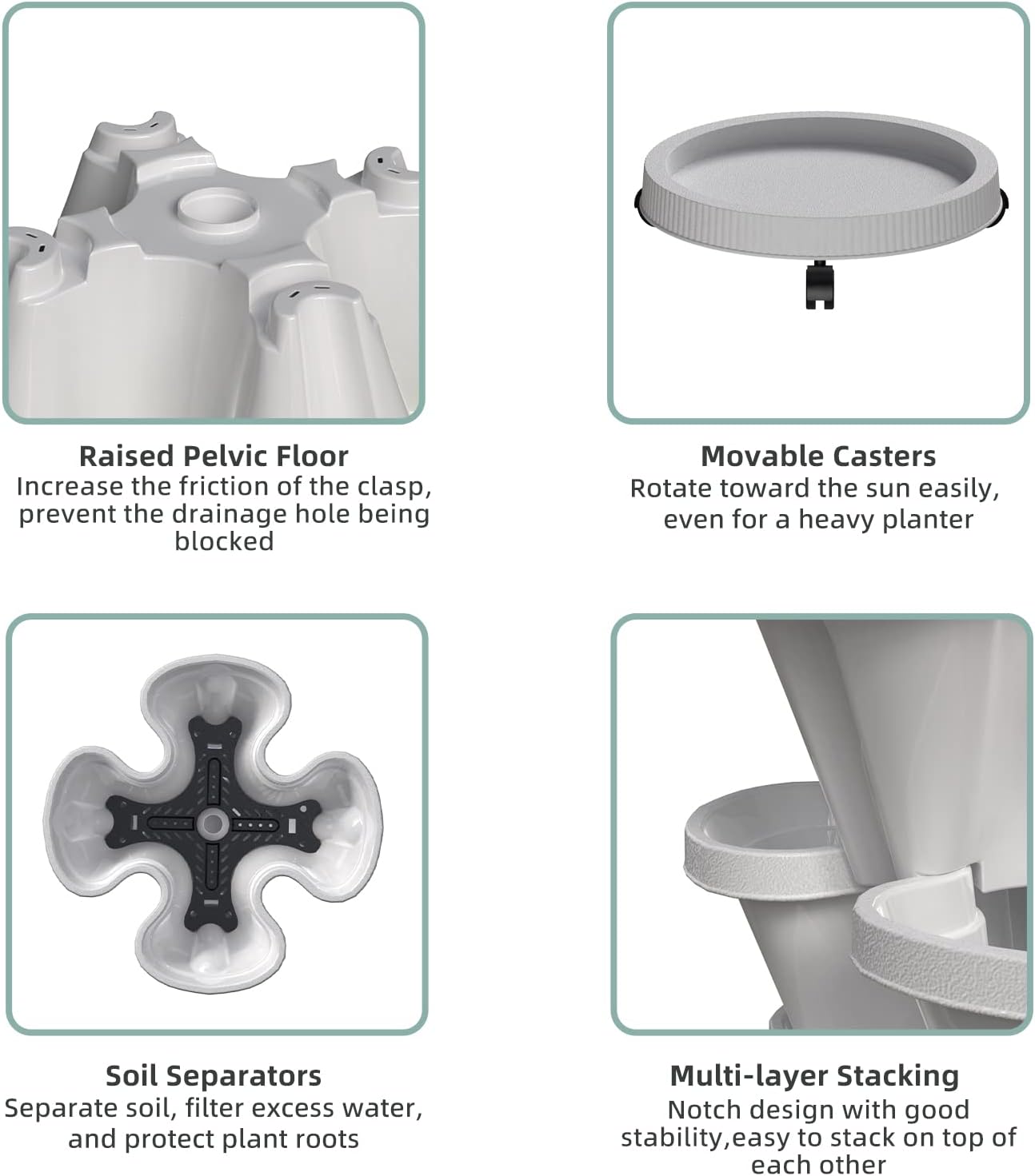 - Flow Design - The water filtration system from top to bottom can save water and retain moisture but prevents overwatering or root rot. 6 filters are placed on each level to keep the soil from going through the big drainage holes, it also helps retain water in each planter level.