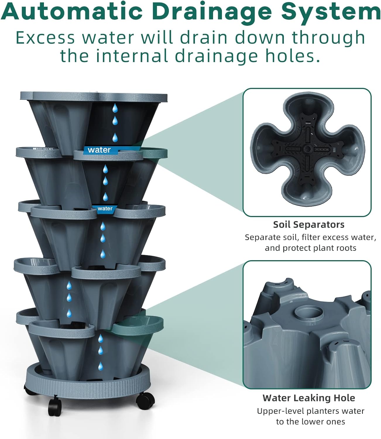 - 6 Tier Vertical Planter - 6 tier stacking planter, made of BPA-free material, can hold up to 24 different plants, such as strawberries, spinach, leaf lettuce, arugula, and mustard greens, and a few smaller herbs and flowers. Plus, it's the perfect vessel for strawberries as the berries cascade over the container lip.