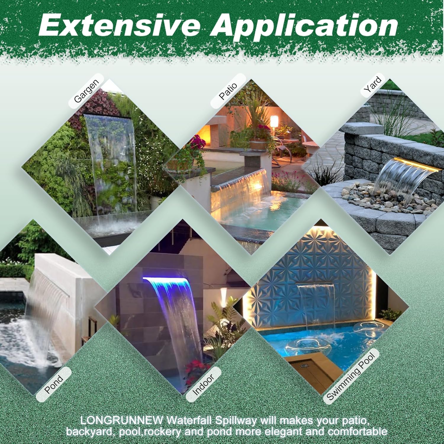- 【Garden & Pond Decoration Waterfall】- The LONGRUNNEW waterfall spillway lends decorative elegance and beauty to gardens and pools. With optional color-changing LED light strips sold separately, it creates a special ambience at night. The gentle sound of the cascading water enhances outdoor patios. Note that LED light strips are not included with the waterfall, but are available for separate purchase in our store.
