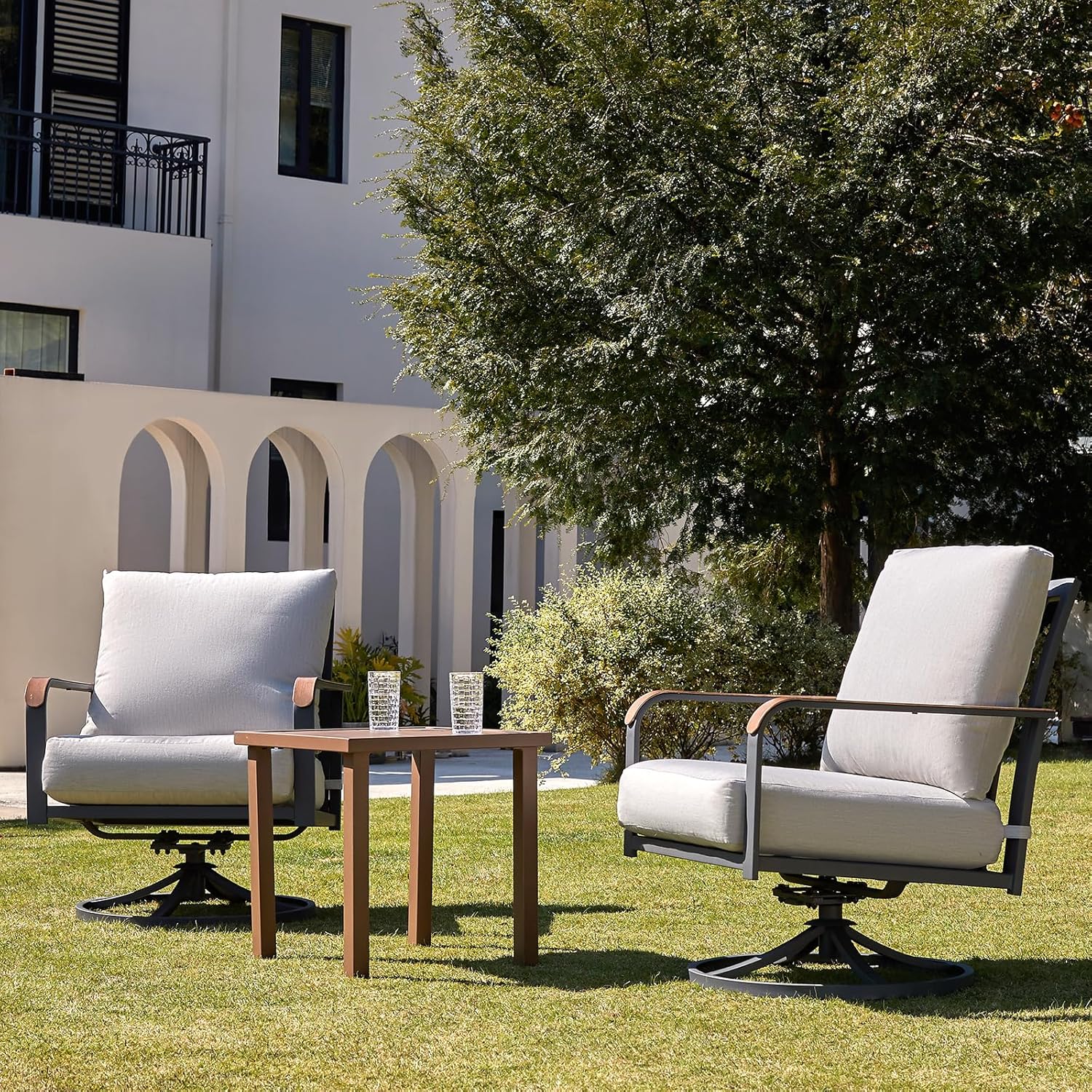 - 【Rust Resistant Frame & Wood Grain Armrest】This outdoor swivel rocker chair is made of powder coating metal frame,which is rust resistant and heavy duty, support up to 350lbs .The wood grain armrests add a sense of decoration, and the ergonomics high back can give your more comfort.