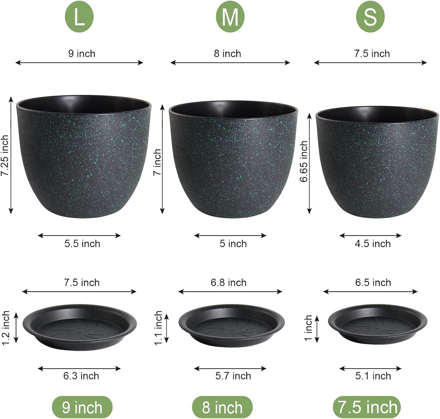 Modern Plant Pots Set, 9/8/7.5 inch Plastic Planters for Indoor Plants, Stylish Flower Pots with Drainage Holes and Saucers for House Plants and Flowers, Black with Green Speckles