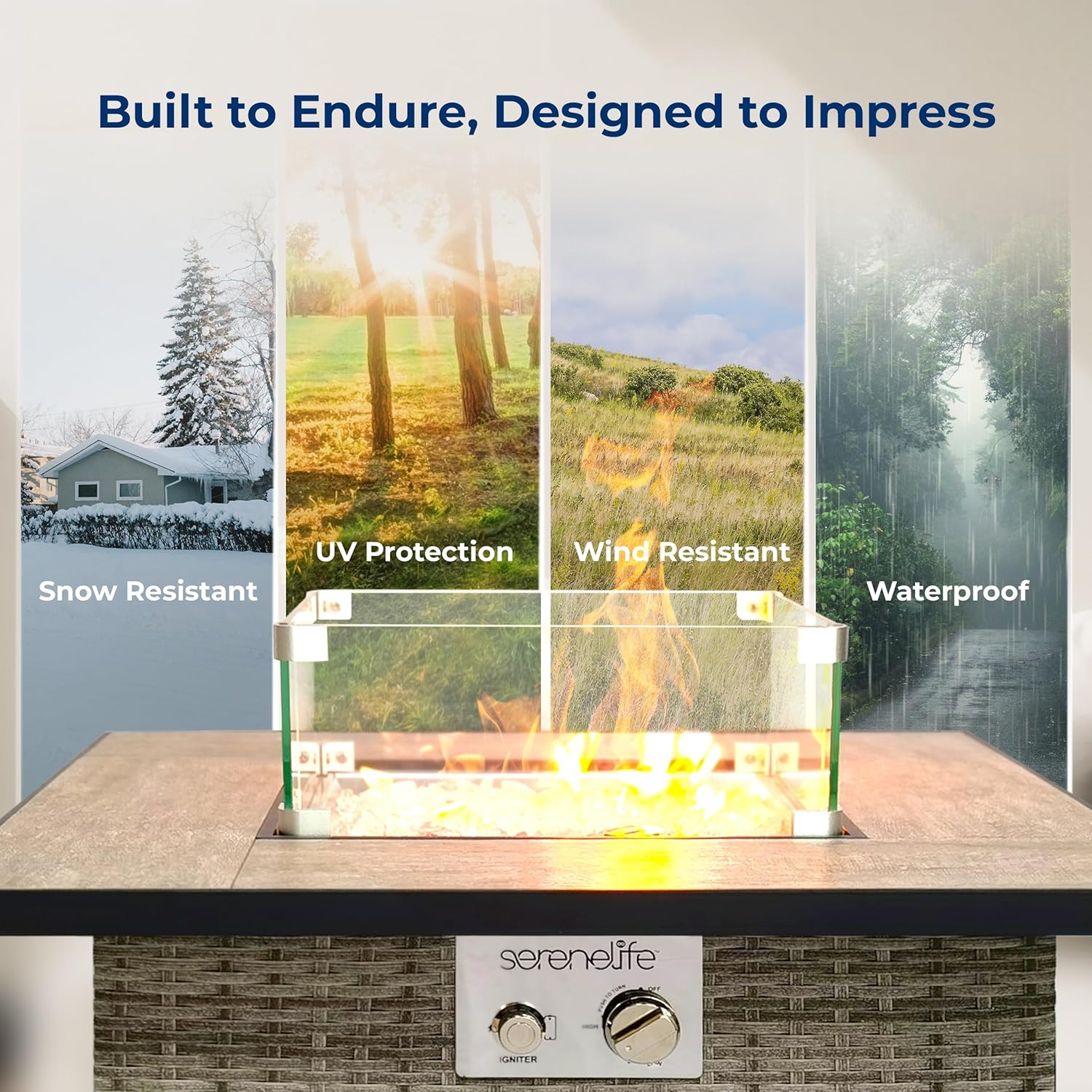 - FIRE PIT AND TABLE IN 1: This fire table not only provides heat to keep you warm during winter it also doubles as a table in summer. Creates an elegant atmosphere in the garden, terrace, balcony, or backyard. Comes w/ a box of clear glass rocks