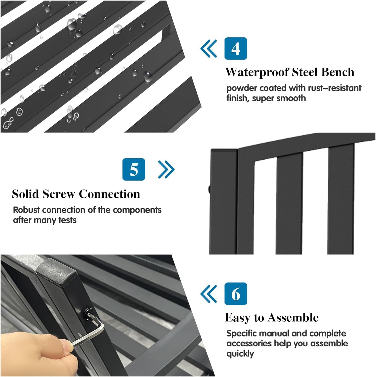 - 【Easy to Assemble & Clean】 The black outdoor bench with simple structure can be assembled effortlessly according to the easy to follow instruction. You only need connect the parts with bolts by using the wrench included in the package. Besides, the smooth surfaces only need to be lightly wiped with a cloth.