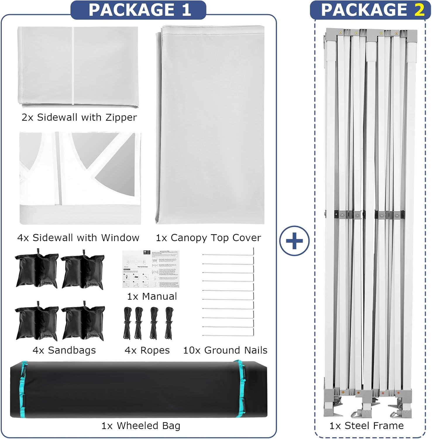 - 【What Will You Get】1x 13x26 Commercial Pop-up Canopy Frame, 1x 13x26 Canopy Top Cover, 6x PU coated SideWalls(4x SideWalls with Window and 2x SideWalls with Zipper), 4x Sandbags, 10x Ground Nails, 4x Ropes, 1x Wheeled Bag, 1x Manual. NOTE:We will divide the frame and other things into two boxes to ship. If you have any problems and questions, please feel free to contact us, we will give you the best service.