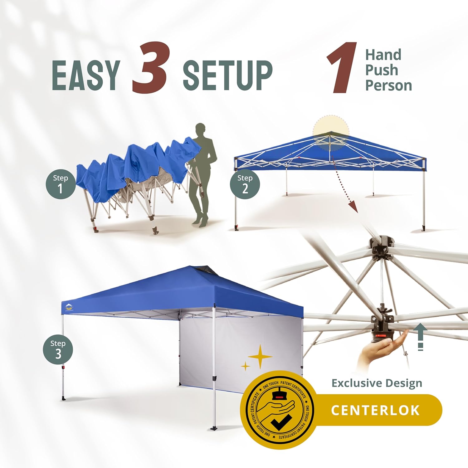 - ONE BUTTON EASY SET UP - Our canopy tent features patented one push center lock technology. With just a single push, the central hub locks all four legs in place. Use the soft pinch-free buttons to easily adjust the leg height. Designed for the next generation, this canopy can be set up by two people in seconds without any tools. Three adjustable height settings ensure convenience and safety, making it perfect for camping, beach outings, craft fairs, tailgating, farmer markets, and more.