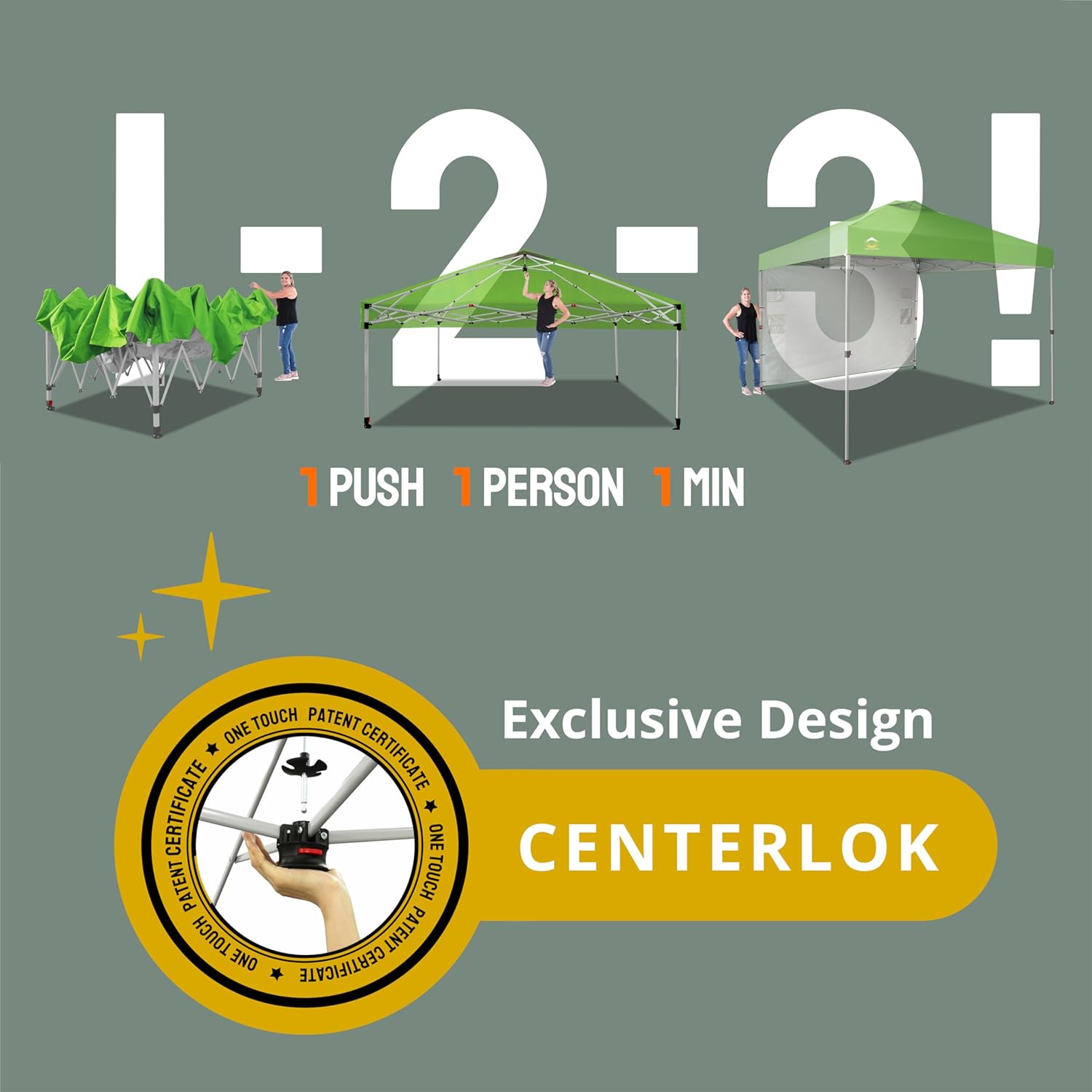 - ONE BUTTON EASY SET UP - Our 10x10 pop up canopy tent features patented one push center lock tech. With just a single push, the central hub locks the poles in place. Designed for the next generation, this outdoor canopy for patio can be set up by two people in seconds without any tools. Three adjustable height settings with soft, pinch-free buttons ensure convenience and safety, making it perfect for camping, beach outings, craft fairs, tailgating, farmer markets, outdoor BBQs, and more