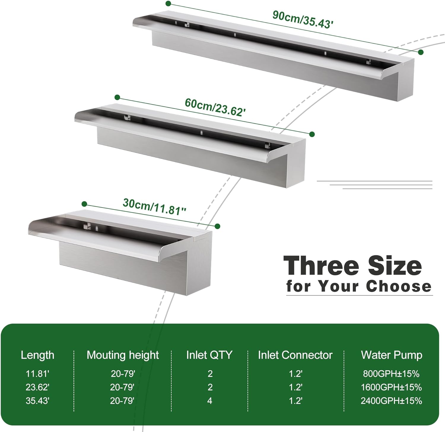 - 【Anti-Rust Spillway Waterfall】- Our welded in one body one-piece 304 stainless steel construction of this spillway waterfall provides long-lasting strength, rust resistance, and leakproof performance. The open lip design creates an elegant freefalling waterfall that adds decorative flair to ponds and pools. The soothing sound of the cascading water promotes relaxation and tranquility. LED light strips not included, but available separately.