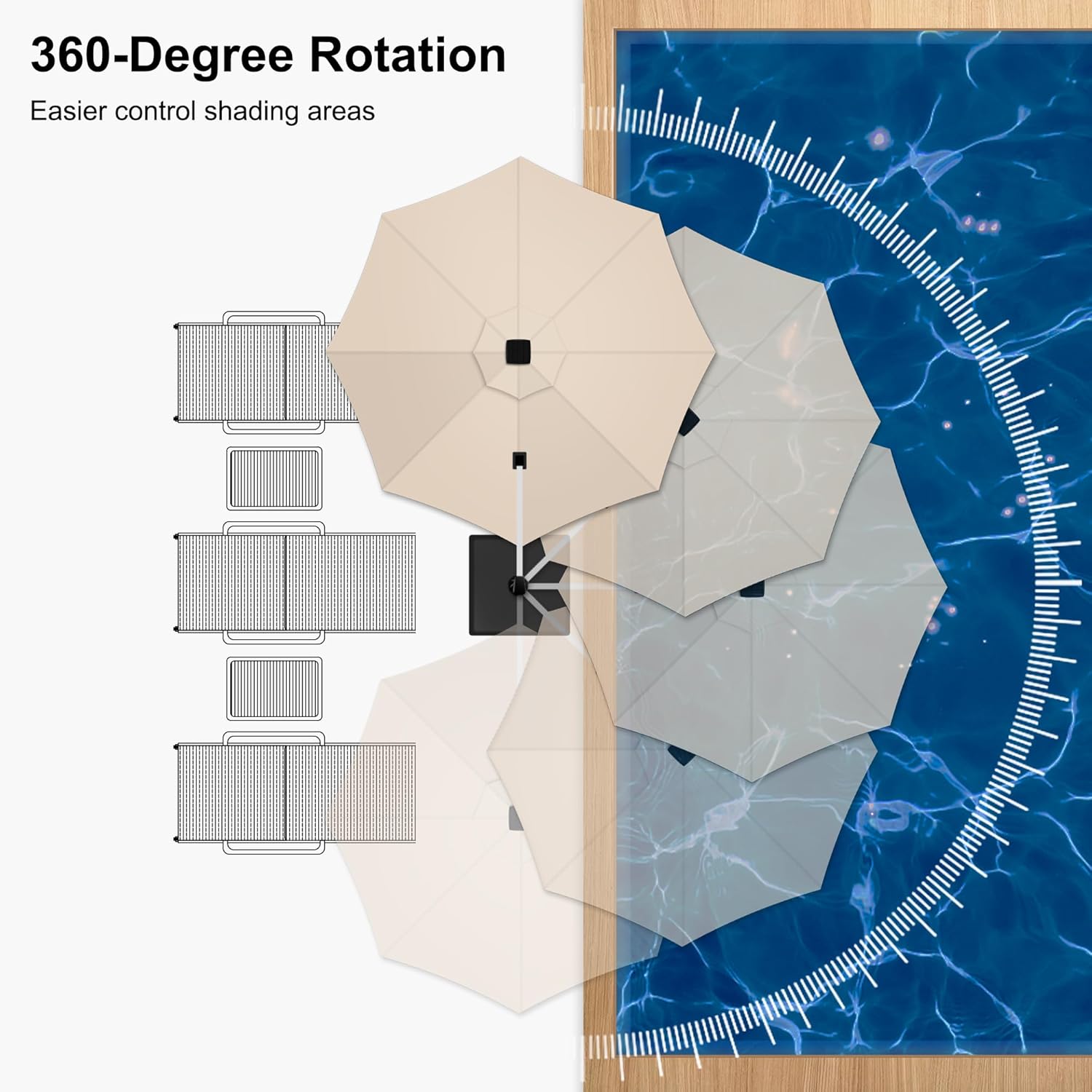 - The crank system and unique handle design allow for easy adjustment of the angle. The 360-degree rotation feature provides versatile sun protection