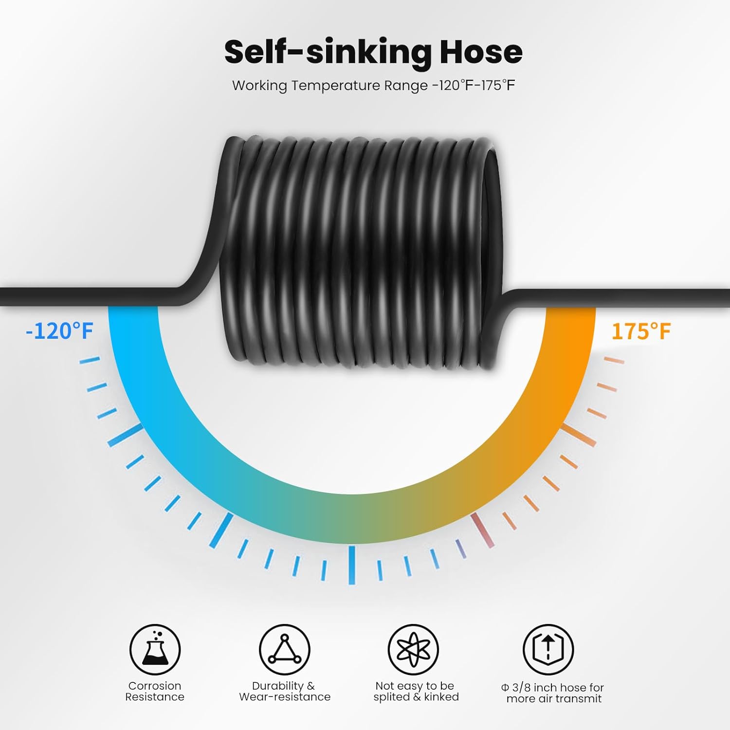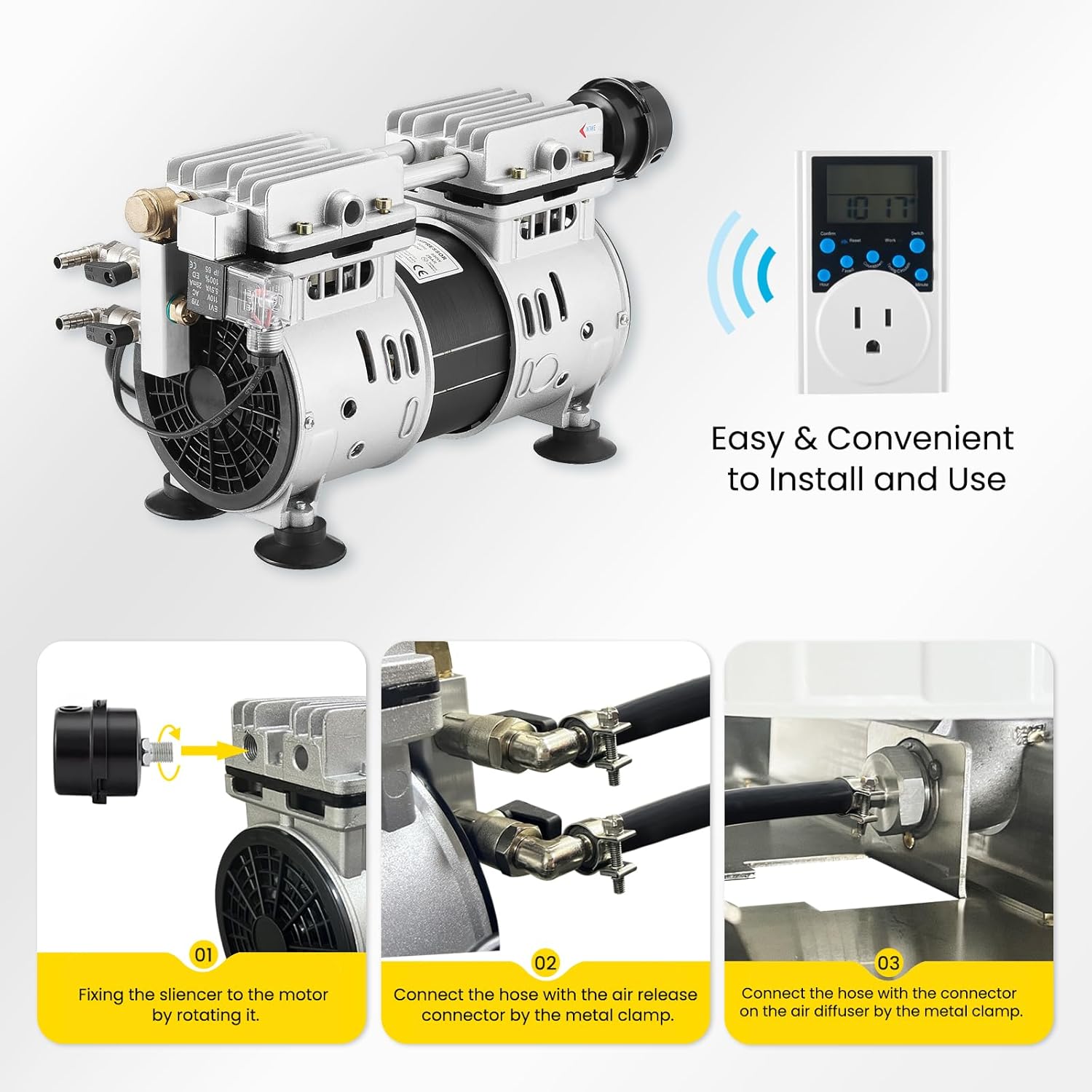 - 3/4 HP Air Compressor — Highly efficient and quiet 3/4 HP oil-free Rocking Piston Air Pump, with maximum 5.2 CFM air volume and below 60DB low noise level, strong power to promote the underwater oxygen circulation