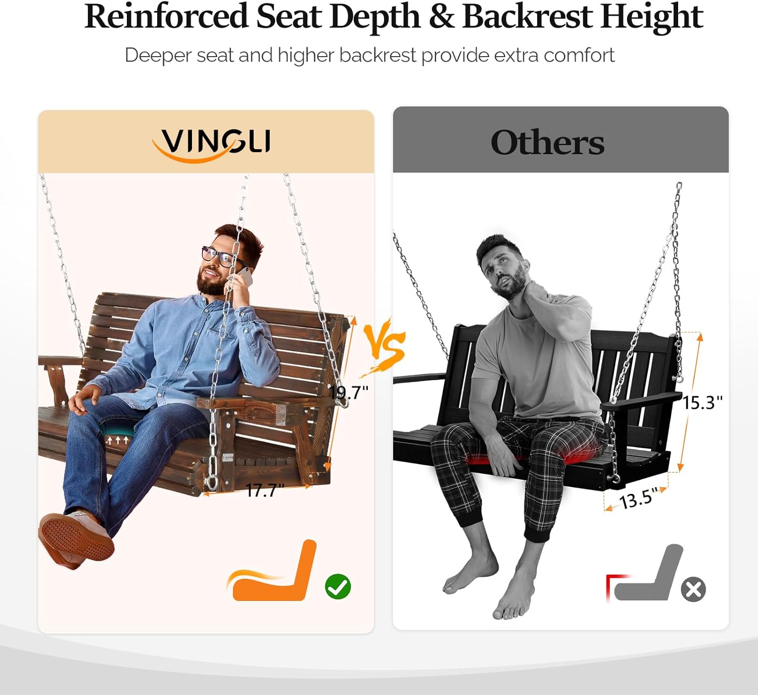 VINGLI XL Size Patio Wooden Porch Swing Outdoor with Cup Holders & Phone Slots, Heavy Duty 880 LBS Hanging Swing Chair Bench with Hanging Chains for Yard, Lawn, Garden (5 FT Pro, Rustic)