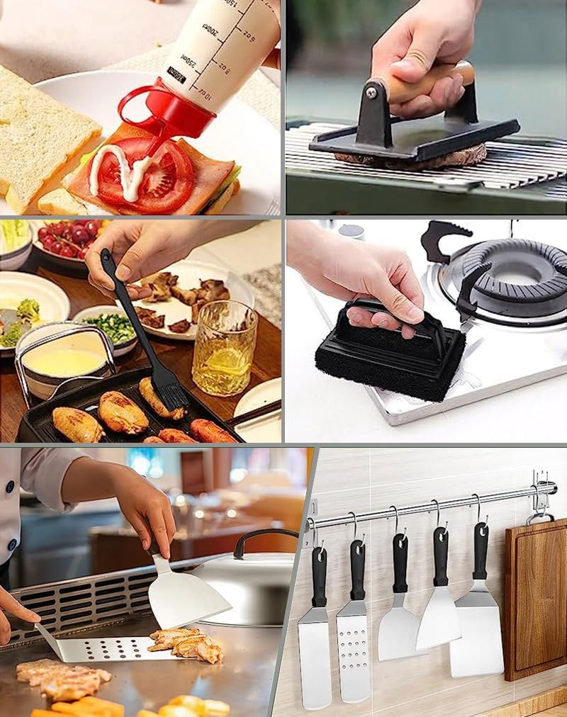 - 【Perfect 149 pcs BBQ Accessories】The griddle accessory kit includes: 1 long griddle spatula, 1 slotted spatula, 1 burger flipper, 1 slant edge scraper, 1 cast iron griddle press, 1 grill tongs, 1 grill fork, 2 squeeze bottle, 1 chopper, 4 corn holder, 4 egg ring, 1 cleaning brush, 2 spice shaker, 1 meat injector, 1 meat knife, 2 meat claw, 1 plastic burger press, 100 bamboo skewer, 8 BBQ skewers, 1 meat thermometer, 2 sauce brush, 8 hanging hook, 1 basting cover, 2 silicone glove, 1 apron.