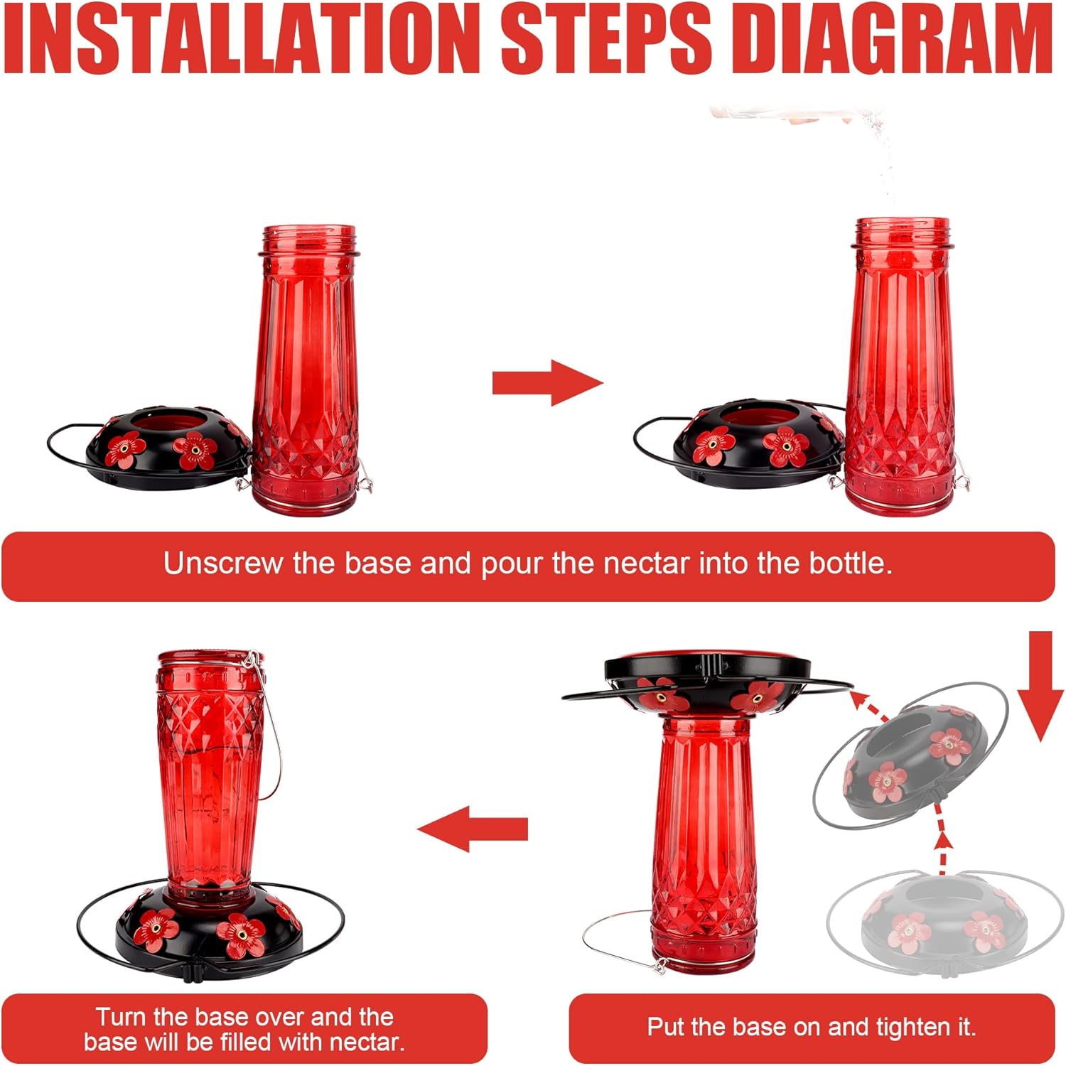 - EASY TO REFILL AND CLEAN: Humming bird feeder wide mouth bottle design, transparent glass, the feeder is easy to disassemble and assemble.