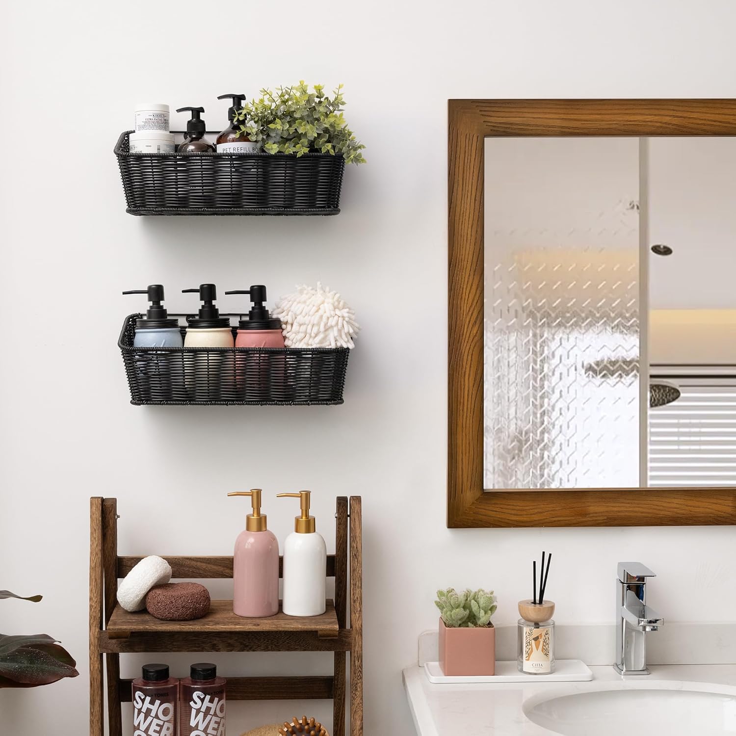 GRANNY SAYS Wicker Hanging Basket, 2 Pack Wall Basket for Kitchen, Fruit and Vegetable Storage Cabinet, Pantry Storage Spice Organization for Cabinet, Adhesive Shelf for Bathroom, Black