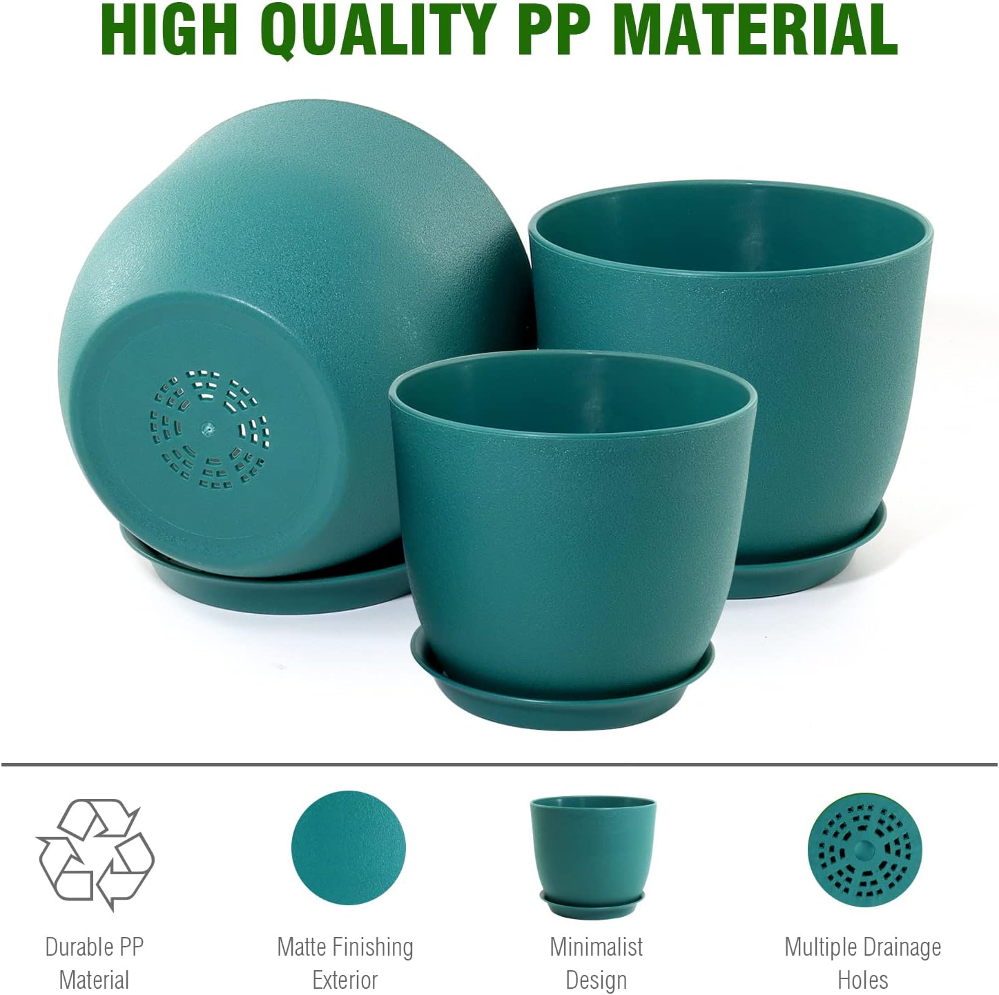 Flower Pots 10/9/8 inch, Set of 3 Modern Decorative Plastic Planters with Drainage Holes and Tray for House Plants Indoor Flowers Plants, Plant Pots for Indoor Outdoor Plants, Blue Green