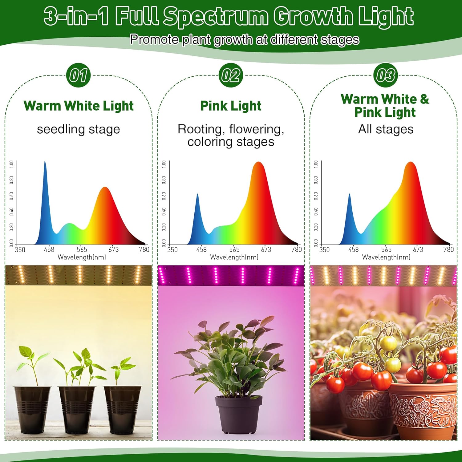 - 💡Full Spectrum Growth Light: Illuminate your plants with our 3-in-1 full spectrum growth light; Tailor the lighting modes to your plants' growth stages - Warm White (boosts stem growth), Pink (aids in rooting, flowering, and coloring), and Pink-White alternation (suitable for all stages); Covering wavelengths from 400nm to 780nm, this 15W energy-efficient light accelerates photosynthesis, fostering optimal indoor plant growth