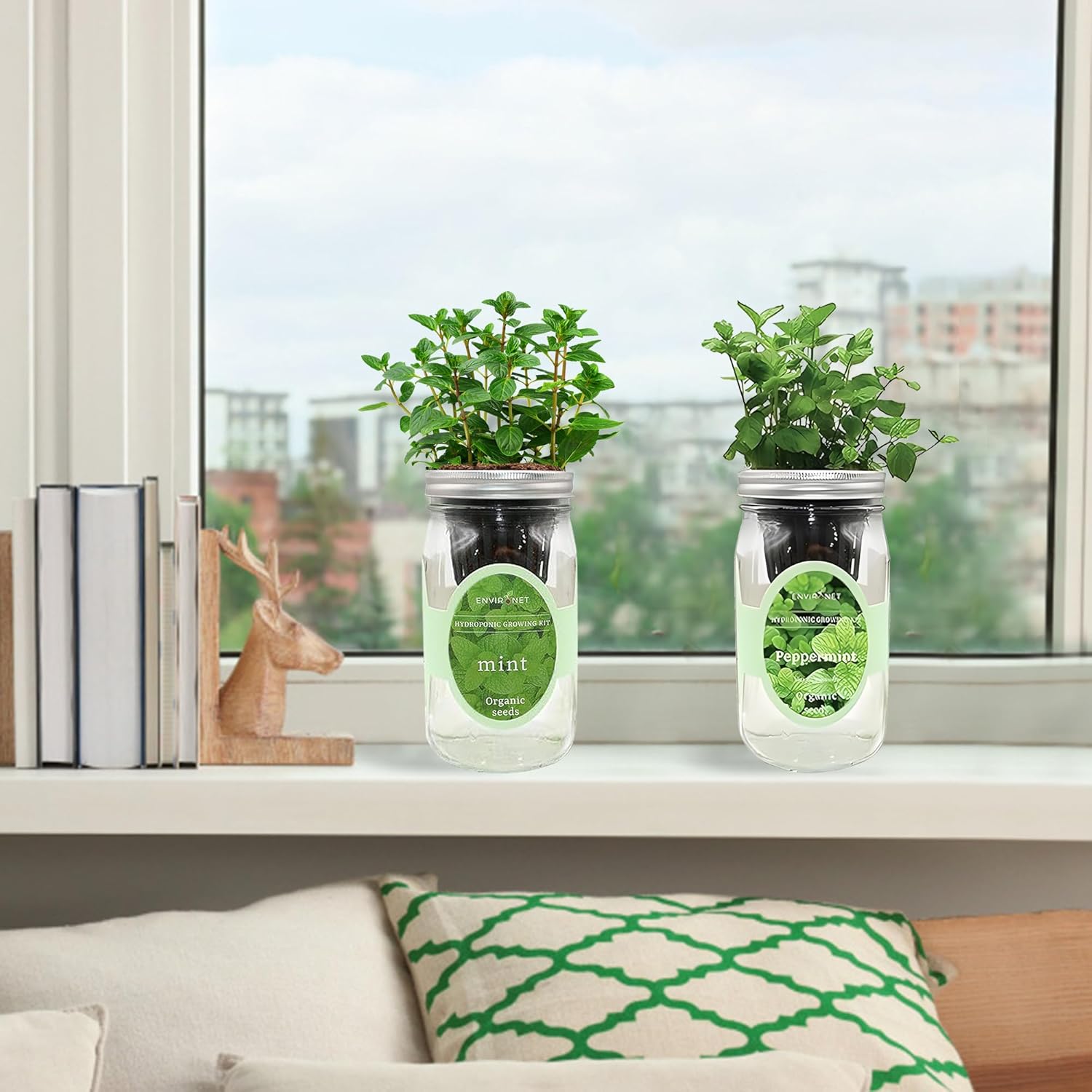 2-Pack Hydroponic Mason Jar Herb Garden Kit, Indoor Herb Garden Self-Watering Starter Kit (Mint,Peppermint)