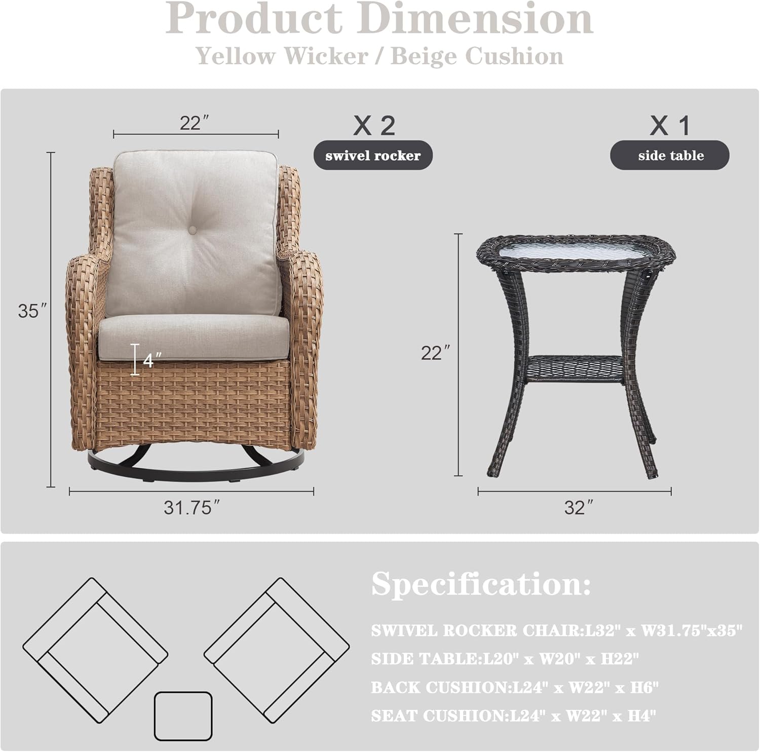 - SOFT CUSHION & HIGH BACK: Our outdoor wicker swivel rocker chairs focus on providing a superior comfort experience. 4Inch Thickened removable seat cushions is filled with high resilience foam for excellent support ,it won't collapse, reduce the pressure on your body and let you relax. Meanwhile, 22Inch high back cushion provides extra back support to avoid discomfort from prolonged sitting.