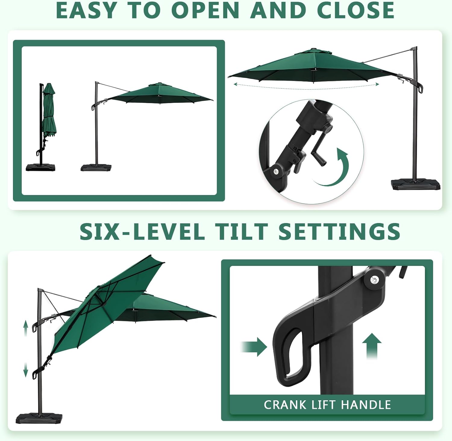 - Fully Adjustable: Simply step on the release pedal of the Abba Patio umbrella outdoor patio for 360°of rotation. Meanwhile, an intuitive tilt system provides additional protection at four different angles. With Abba Patio rotation hanging offset umbrella convenient crank system, a few turns raises the canopy to the perfect height.