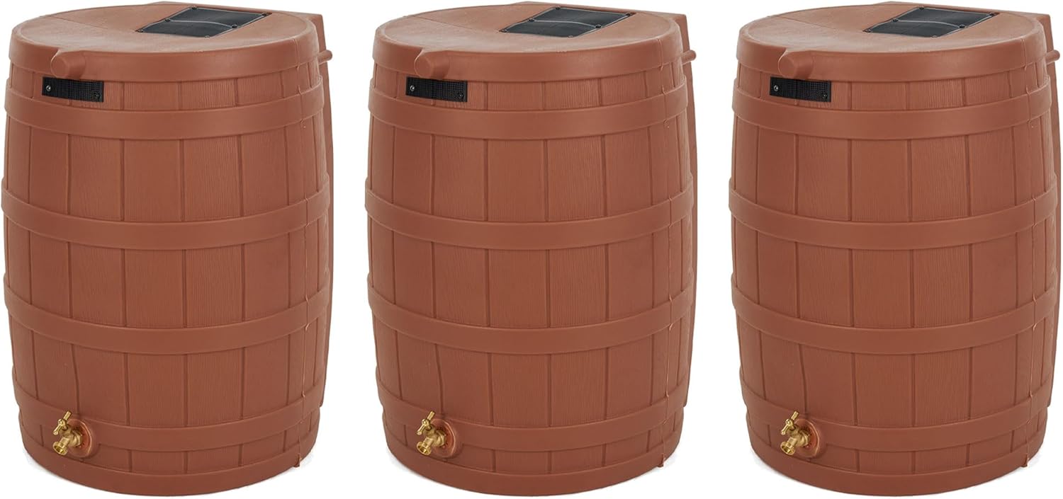 - Rain Barrel: Add style and beauty to your outdoor space while helping the environment by conserving water with this set of 3 50-gallon rain barrel