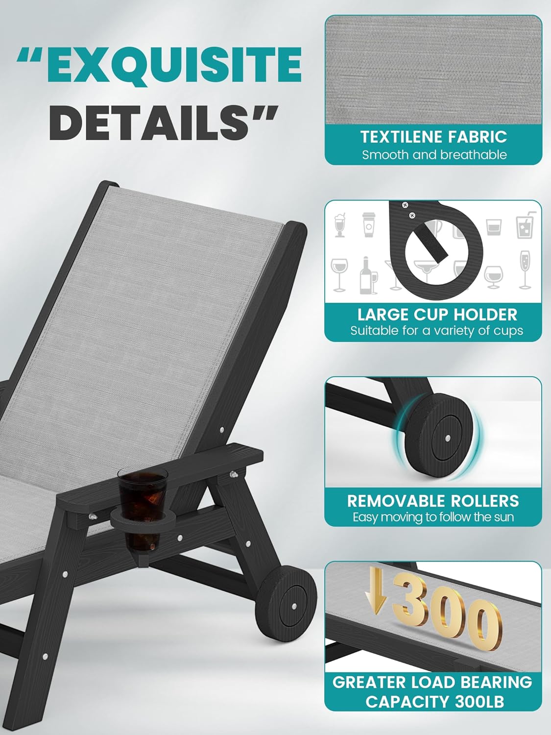 - Rolling Wheels: Equipped with convenient wheels, our chaise lounge chair is effortlessly portable. You can easily move it around to follow the sun or find shade throughout the day, providing you with the flexibility to create your ideal lounging spot.