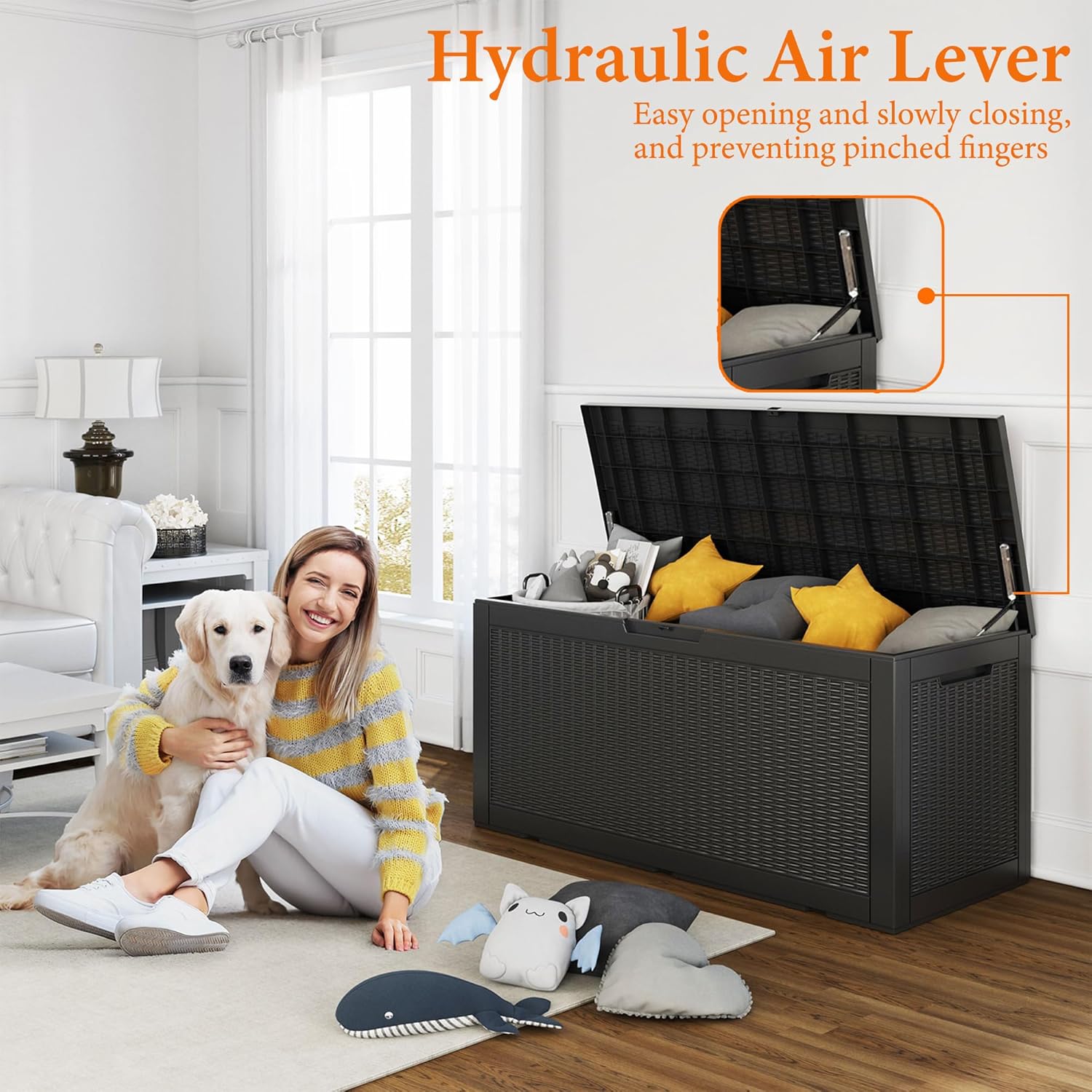 - VERSATILE IN EVERY SETTING: This patio storage box doubles as an indoor laundry organizer and an outdoor yard storage unit for cushions, garden tools, pool accessories, outdoor gear, and more, offering ample space. It can also serve as a side table, patio seat, storage bench, or footstool