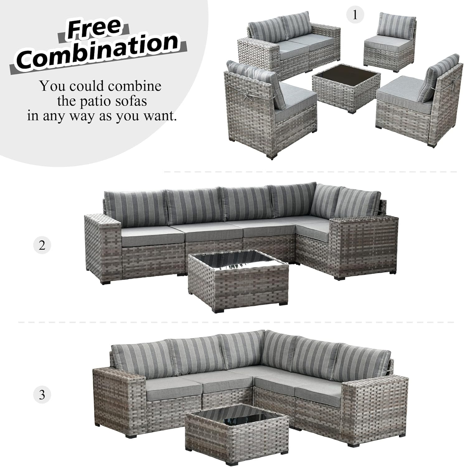 • Sectional Design: Comes with 2 single arm chairs, 2 middle chairs, 1 corner chair and 1 tempered glass top coffee table. With chair connecting clips to lock the chairs together if need be. Modular design enables to make the patio set in any shape you like to fit your needs